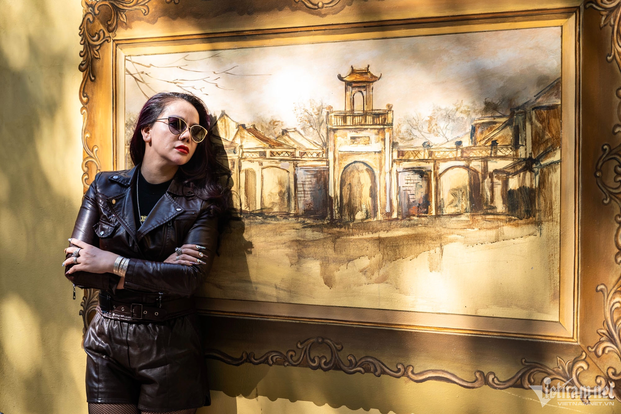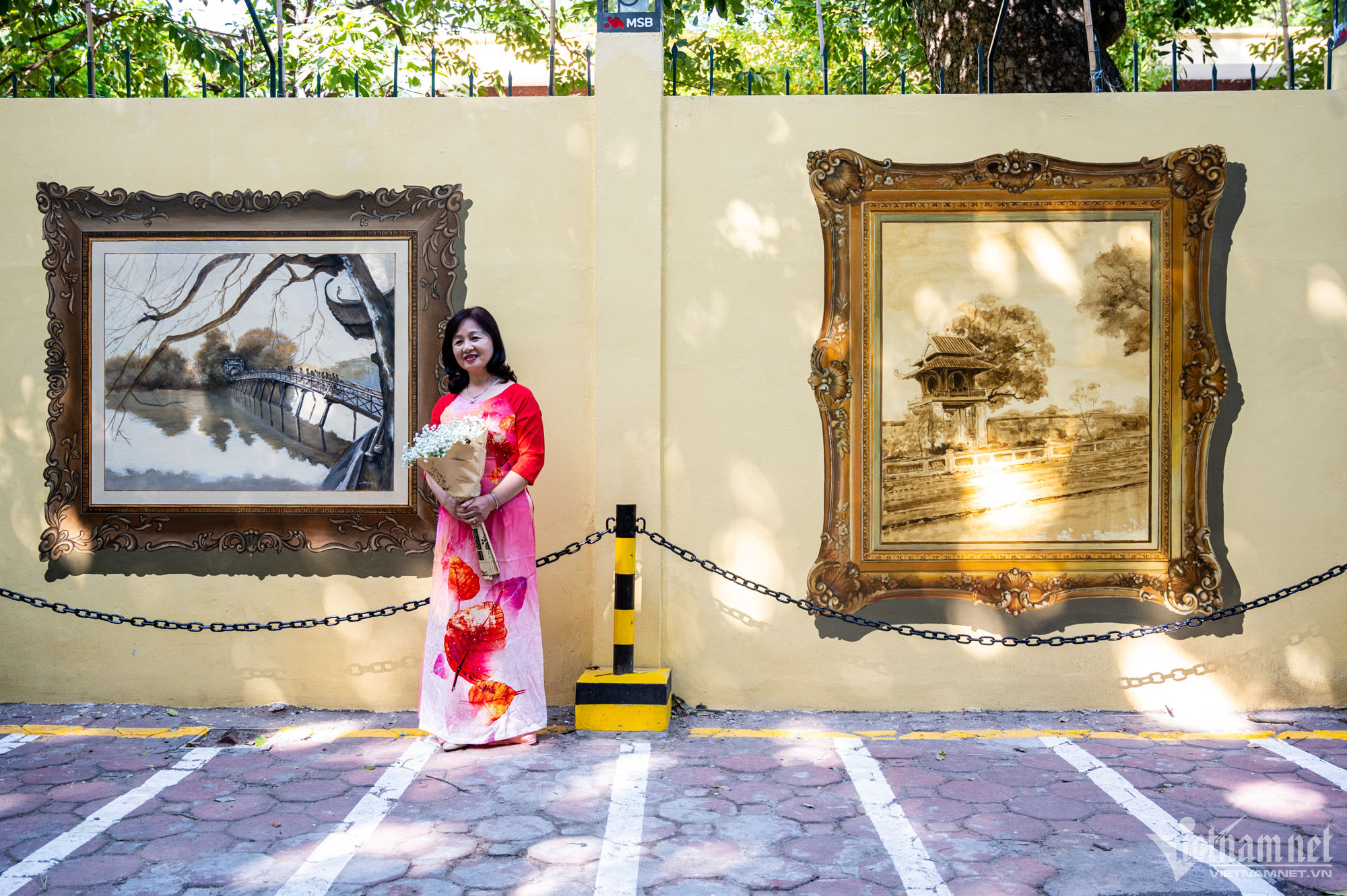 Tranh thủ giờ nghỉ trưa, Quỳnh Hương (Cầu Giấy) cùng bạn ra đây chụp ảnh kỷ niệm. "Ngày nào em cũng đi làm qua đây, cảm giác như được đi triển lãm vậy. Ban ngày có nắng vàng rất rực rỡ, khi tối lên đèn những hình ảnh này cũng rất ấn tượng", Hương chia sẻ thêm.