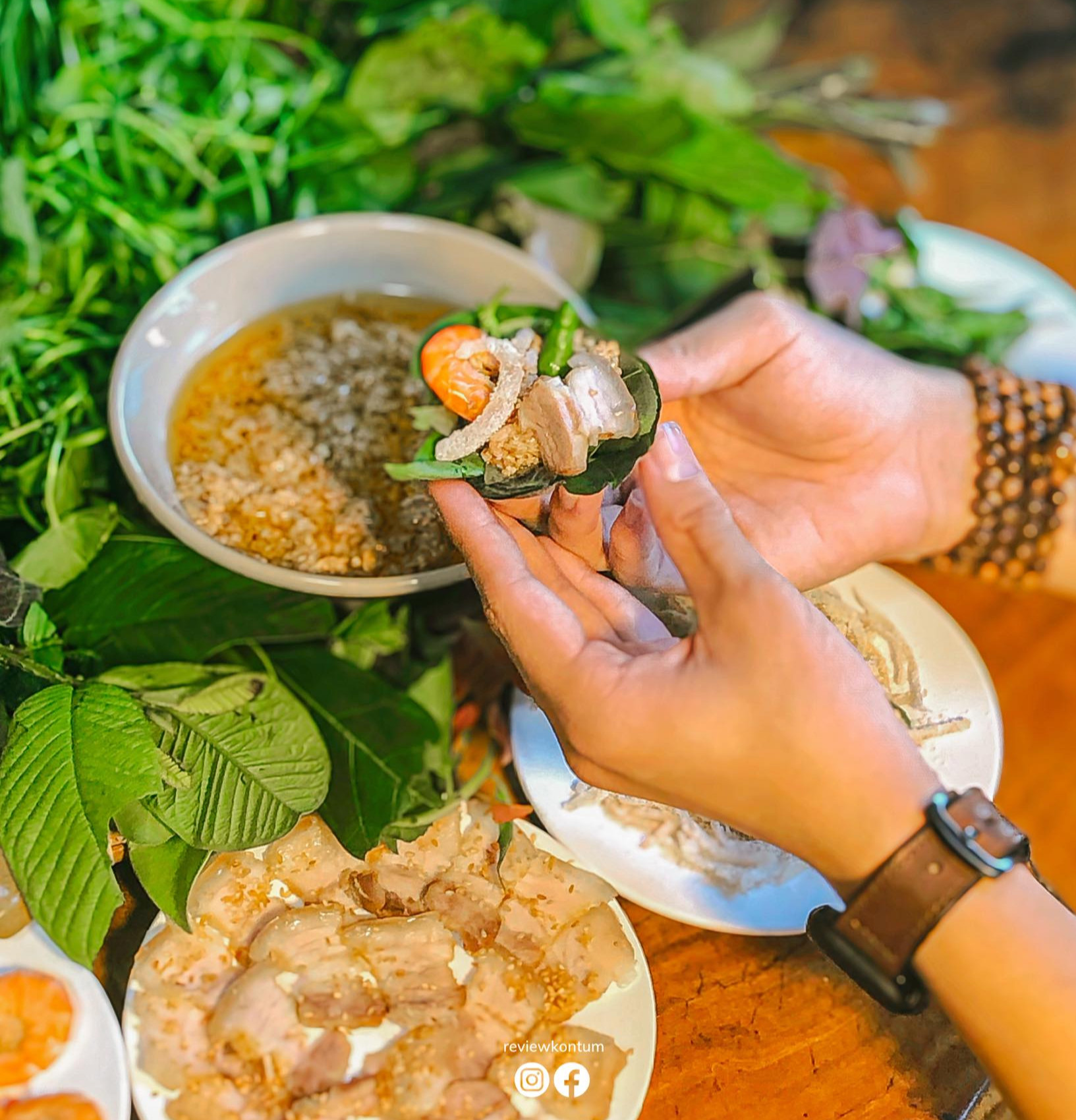 Khi ăn, thực khách cuốn từ từ, lần lượt từng lá. Đầu tiên, người ta dùng một chiếc lá to như lá mơ, lá sung,… cuốn thành hình cái phễu rồi cho tiếp 5 - 7 loại lá tùy thích, đặt lên trên một lát thịt luộc, bì lợn, tôm rồi chan nước chấm lên, thêm chút ớt xanh hoặc tiêu xanh, sau đó đưa vào miệng thưởng thức.