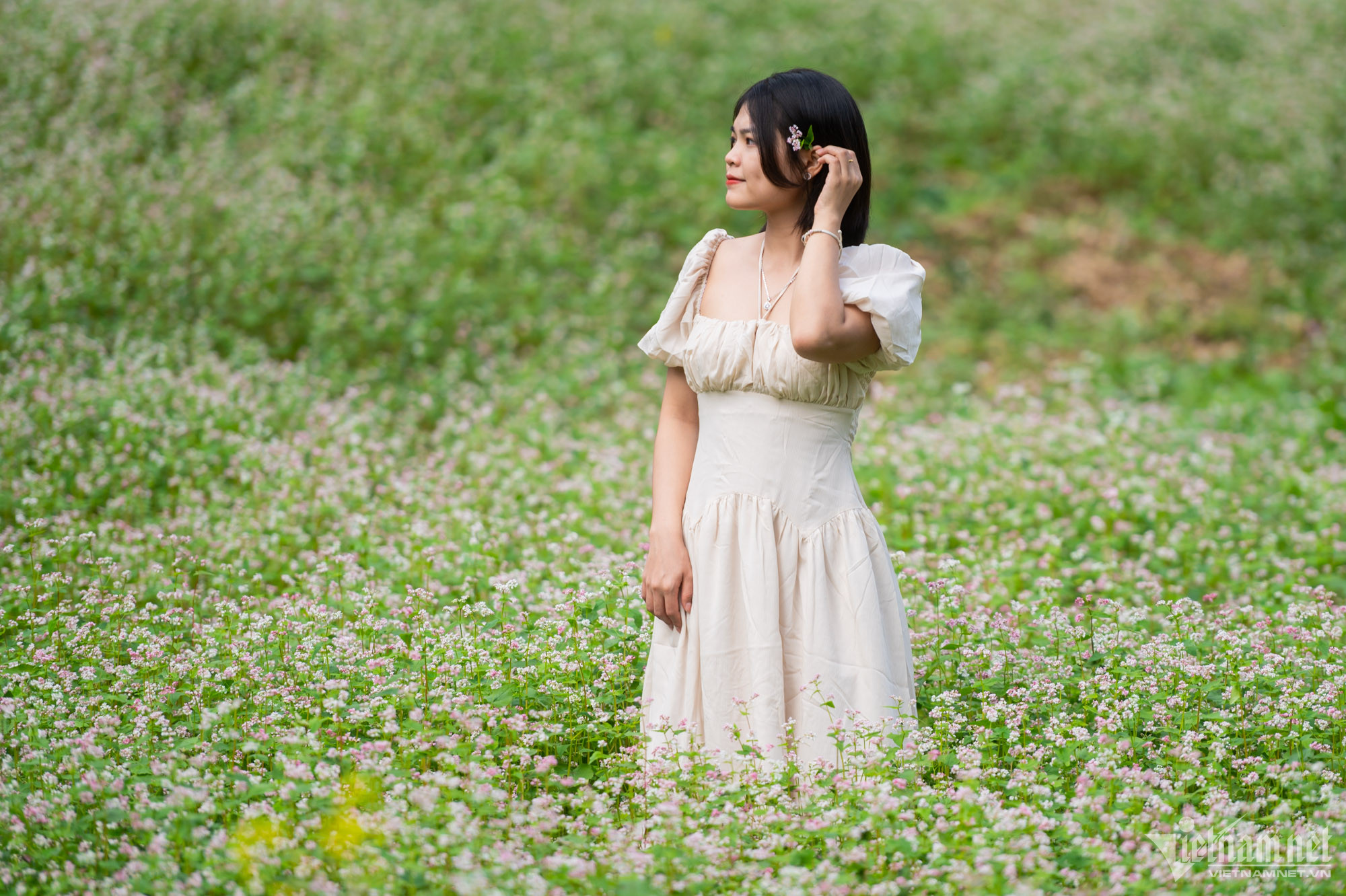 Nhiều bạn trẻ diện váy áo bánh bèo, tinh nghịch cài nhành hoa lên mái tóc để có những bức hình ấn tượng giữa cánh đồng hoa tam giác mạch.