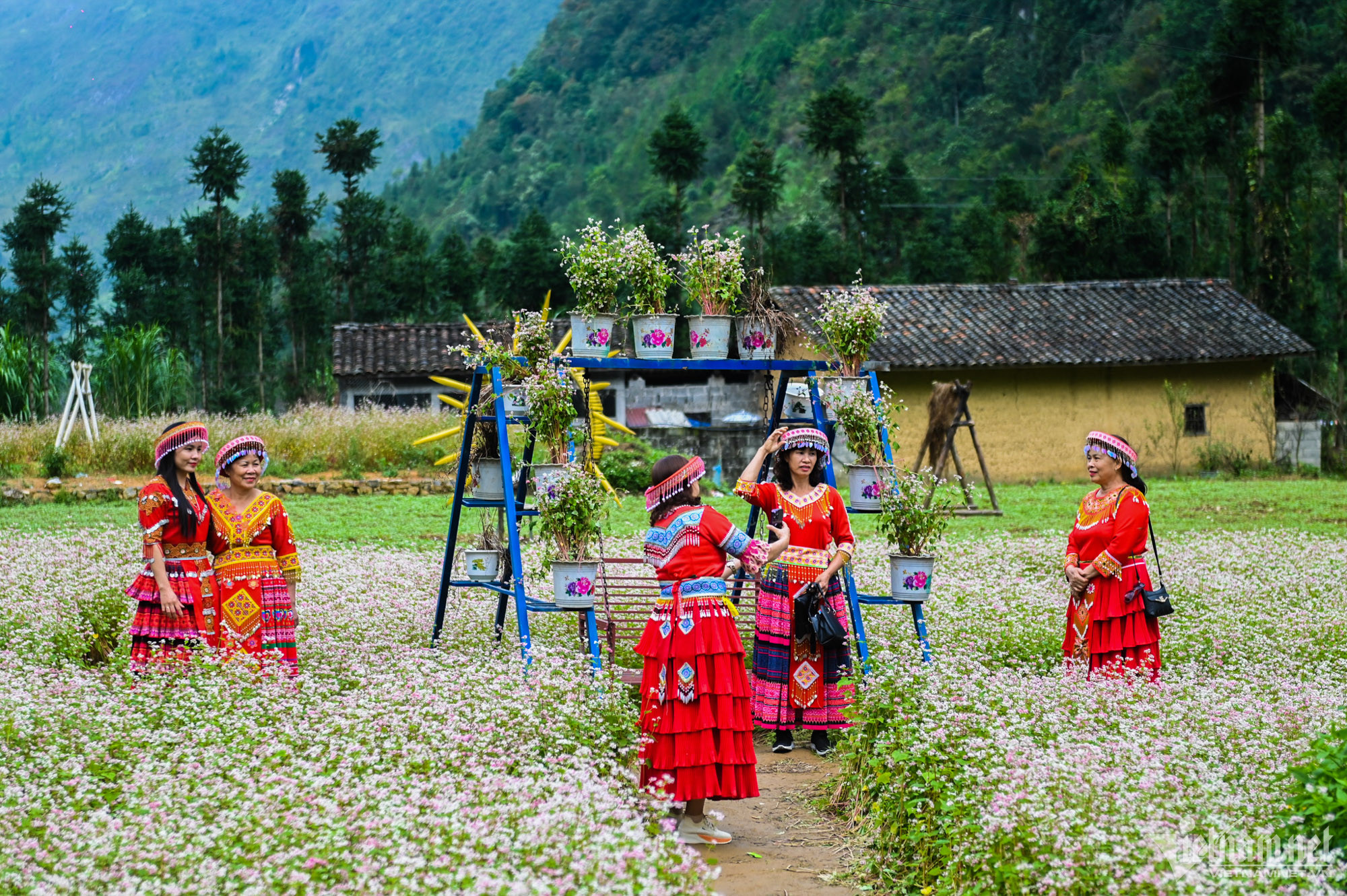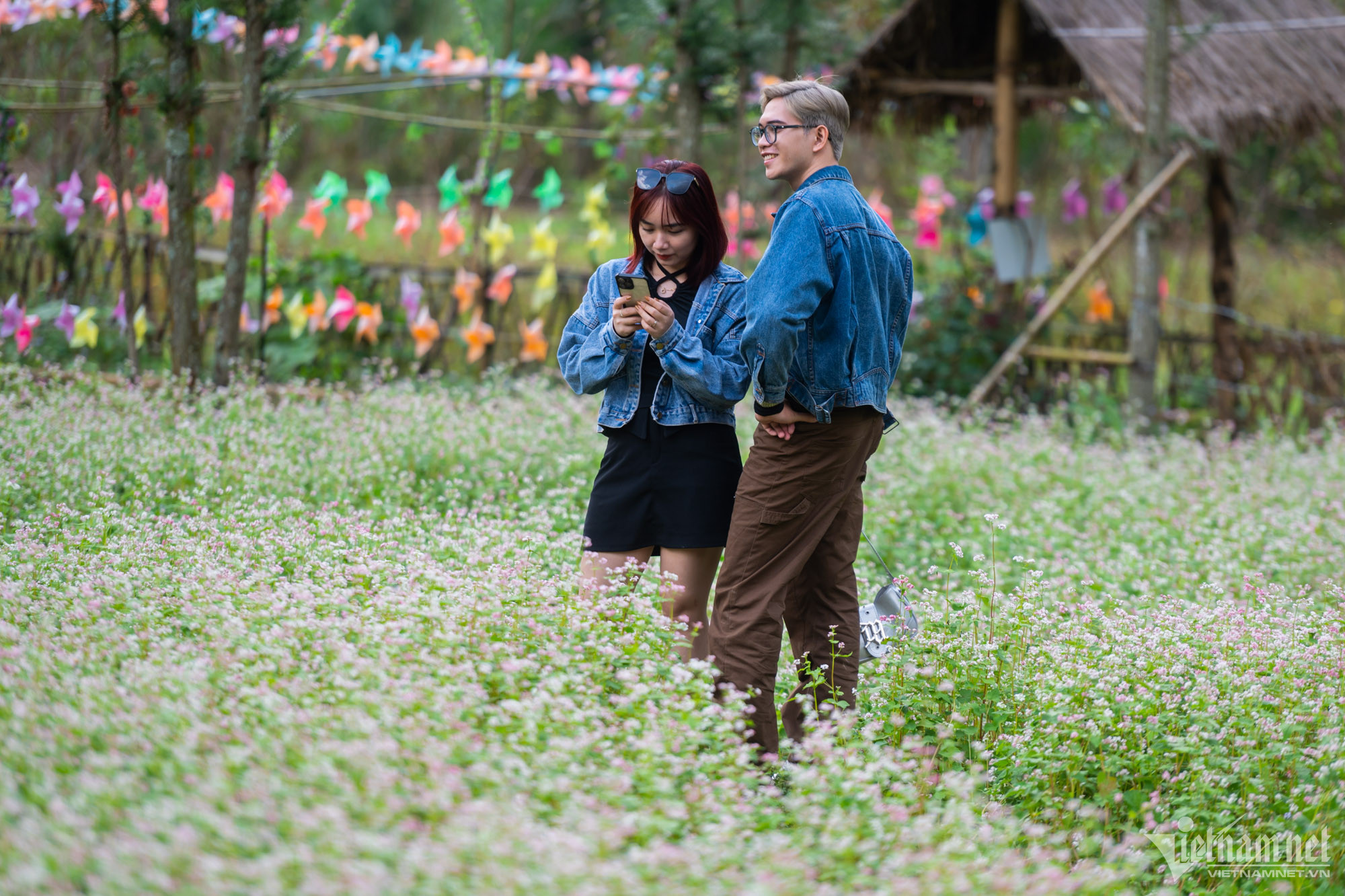 Tại làng văn hoá du lịch Lũng Cẩm, xã Sủng Là, nhiều tiểu cảnh được dựng trên cánh đồng hoa tam giác mạch. Khi vào đây tham quan, khách phải trả phí từ 10.000 đồng/lượt.