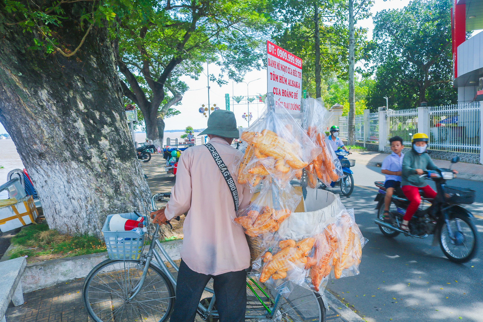 Tới Tân Châu, du khách không khó để bắt gặp hình ảnh những chiếc xe, gánh hàng rong chất đầy bánh mì có kích thước khủng, hình dáng độc lạ như cua hoàng đế, tôm hùm,… trong đó phổ biến nhất là bánh mì cá sấu.
