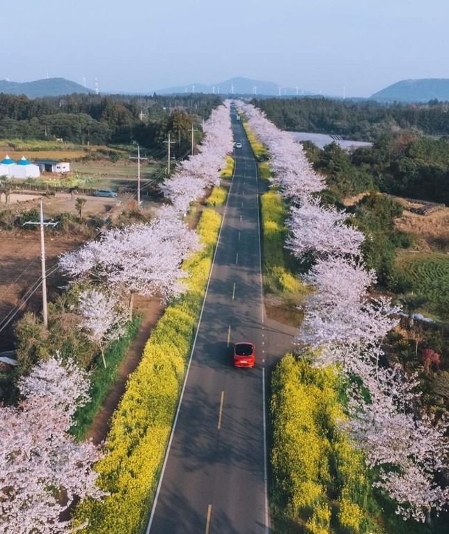 Chiếm trọn spotlight mùa Xuân tại Jeju có lẽ là con đường Jeonnong, nơi hội tụ cả hoa anh đào với sắc hồng dịu dàng và hoa cải dầu với sắc vàng rực rỡ. Theo chia sẻ của Gen Z xứ Hàn, con đường này giao với đường Samsung nên khi ghé đến, các netizen lưu ý đỗ xe tại bãi xe công cộng để có thể thoải mái tản bộ tận hưởng không khí mát mẻ và tha hồ chụp ảnh.