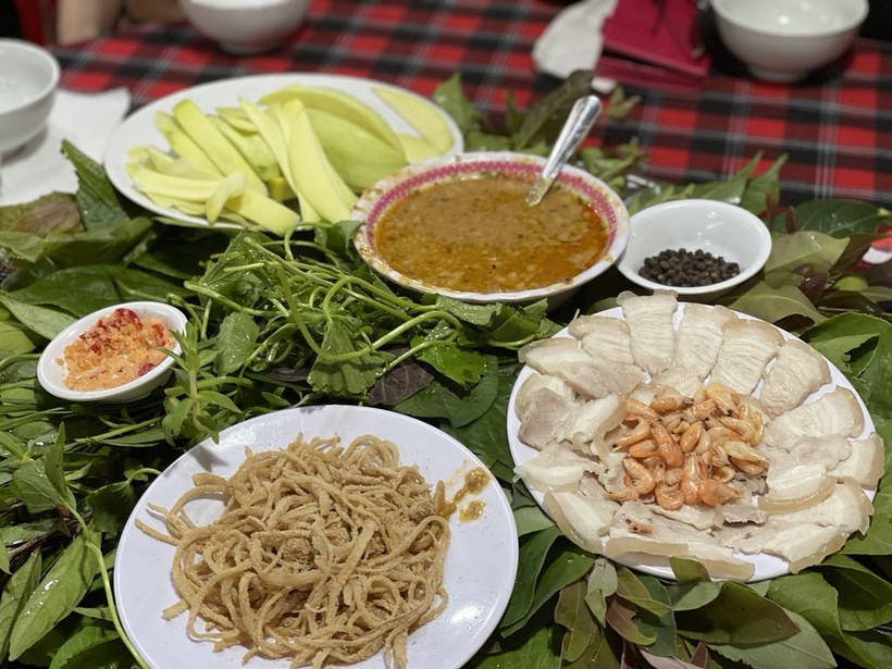 Những món dùng để gói ăn kèm cùng gỏi lá cũng khá đơn giản, gồm có thịt lợn ba chỉ luộc, tôm tươi luộc, bì lợn trộn thính.