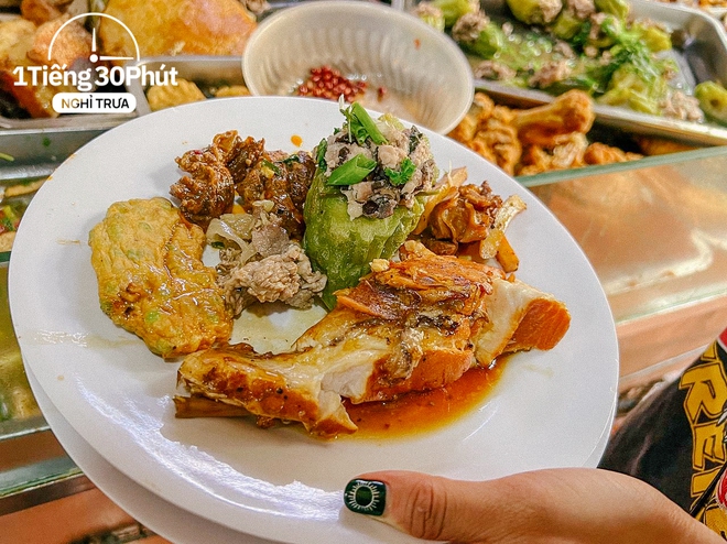 Cô chủ đã đứng tuổi nhưng nhanh nhẹn và niềm nở chỉ các vị khách tự lấy đĩa ở chiếc rổ kế bên rồi ra xếp hàng chờ múc cơm. Ở đây, thay vì chỉ món để người bán lấy giúp thì khách có thể tự cầm kẹp chọn thức ăn sao cho vừa ý.