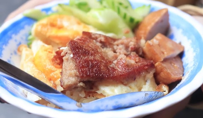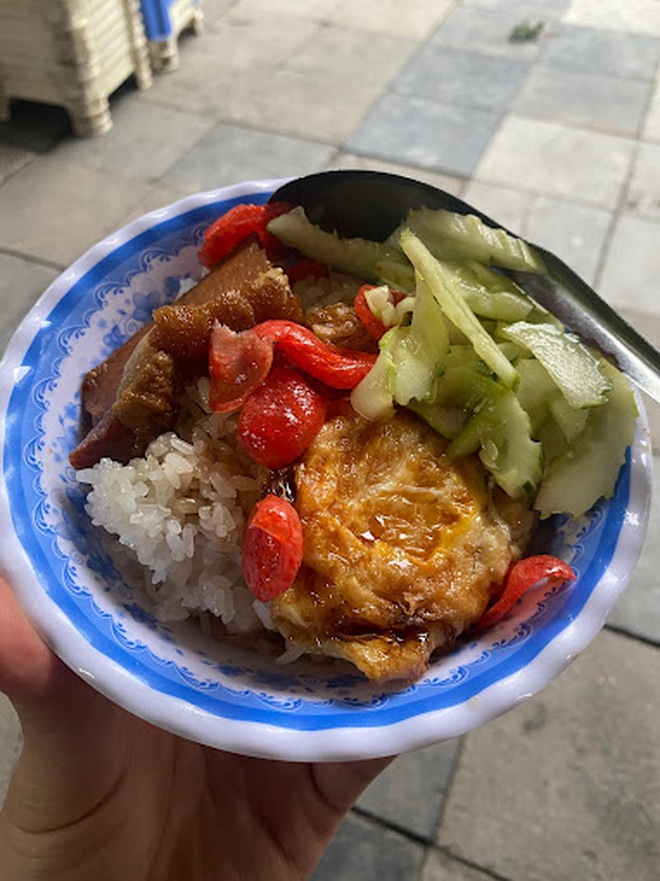 Hàng của chị chỉ có chiếc bàn inox bày nồi thịt quay, trứng rán, trứng ốp la, lạp xưởng, chả… kho nhạt trong nồi, cái chõ xôi và ít ghế nhựa để tạm, thế mà sáng nào cũng làm náo nhiệt cả một góc phố.