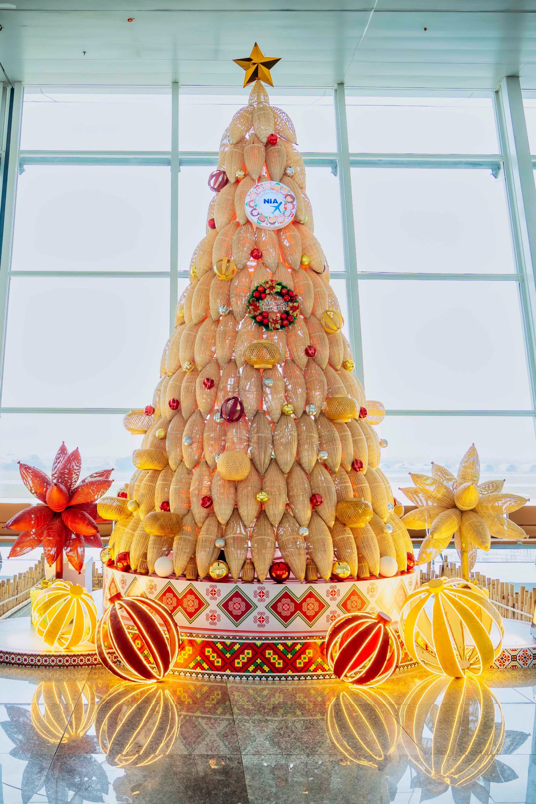 Gây ấn tượng với nhiều hành khách qua sân bay, đặc biệt là khách nước ngoài là hình ảnh một cây thông Noel làm bằng chất liệu đó tre.