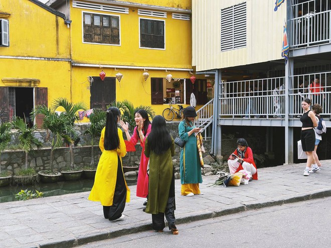 Dù đã hết Tết nhưng du khách vẫn xúng xính trong tà áo dài, check-in trước những con phố nổi tiếng, những cây cầu cổ kính hay những quán cà phê xinh đẹp trong lòng phố cổ.