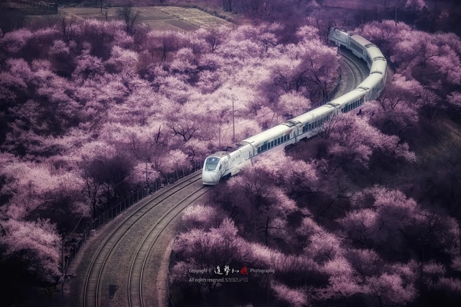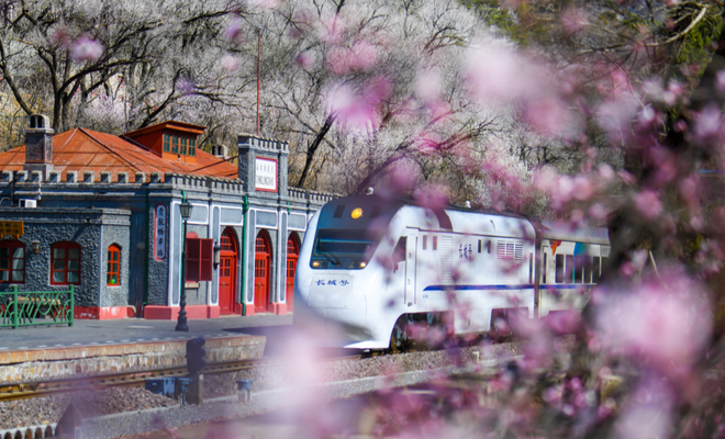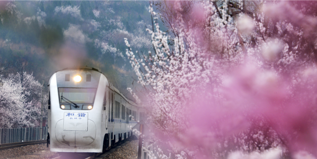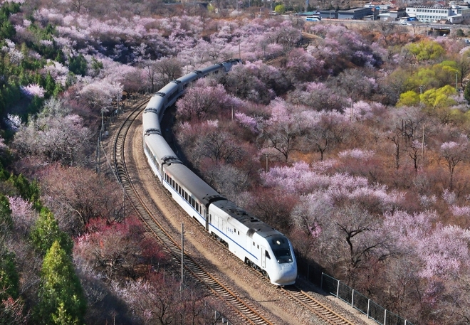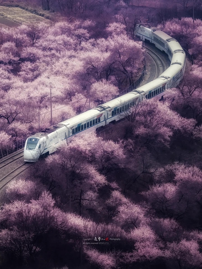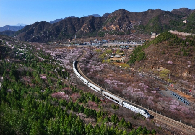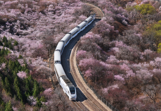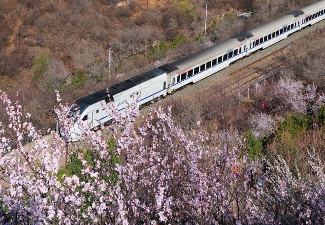 Mỗi mùa xuân, tuyến đường sắt ngoại ô Bắc Kinh S2 đều chứng kiến khoảnh khắc đẹp nhất trong năm, khi đoàn tàu uốn lượn đi qua những dãy núi, nơi sắc hồng của hoa đào và màu trắng nhạt của hoa mơ phủ kín những ngọn đồi. Vẻ đẹp của chiếc tàu màu trắng S2 hòa mình vào biển hoa và Vạn Lý Trường Thành, cùng tạo nên một dải cảnh quan tuyệt mỹ hiếm thấy.