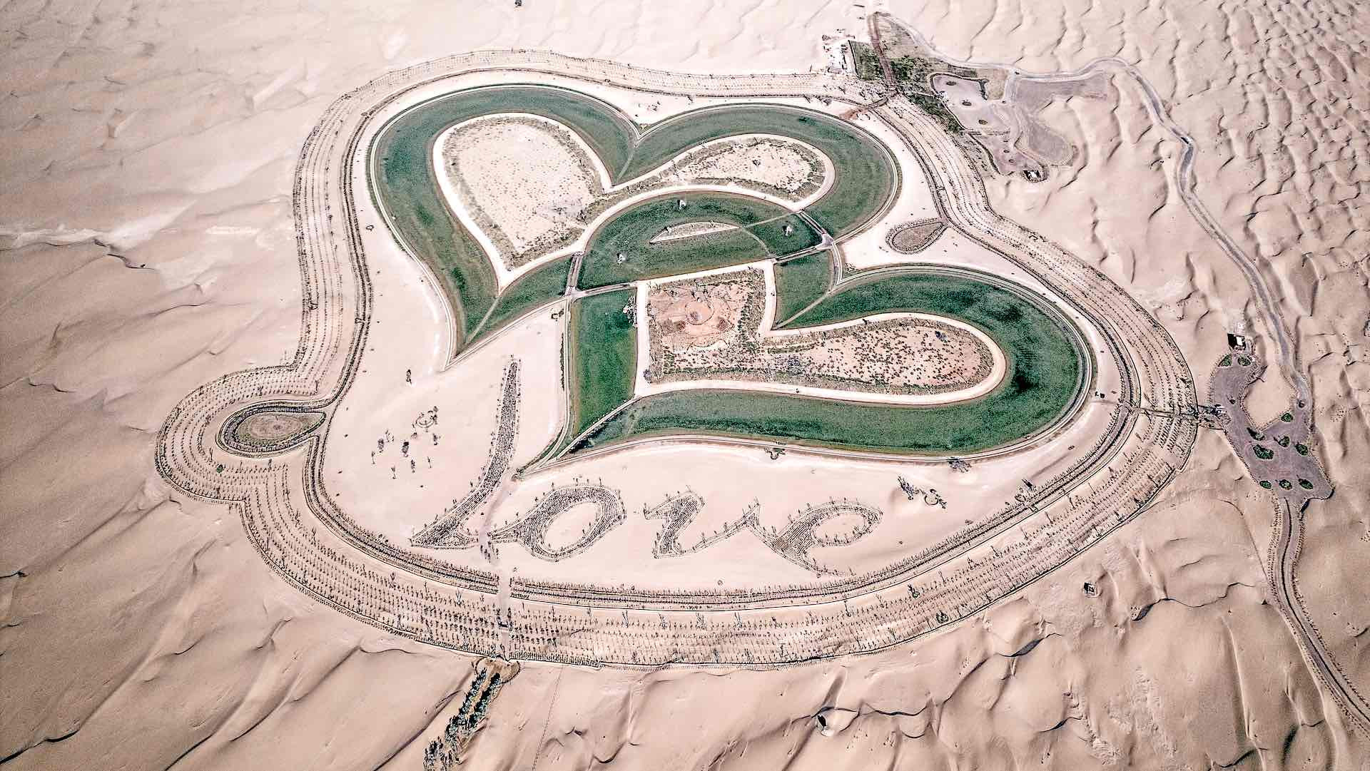 Từ hòn đảo hình cây cọ mang tính biểu tượng đến những tòa nhà chọc trời như Burj Khalifa, Dubai không thiếu những điểm tham quan nổi tiếng thế giới, nhưng còn rất nhiều điều nữa để khám phá trên sa mạc xung quanh thành phố đông dân nhất ở UAE. Một trong những viên ngọc ẩn như vậy là hồ Tình yêu nhân tạo, về mặt kỹ thuật là hai hồ hình trái tim đan xen nằm gần Ốc đảo Al Qudra. Với diện tích khổng lồ lên tới 550.000 mét vuông, địa điểm du lịch tuyệt đẹp này thậm chí còn có thể nhìn thấy được từ không gian.