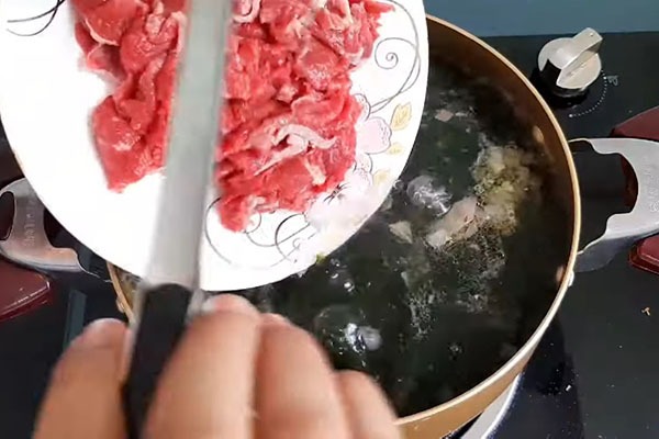 Sau đó, cho rong biển, đậu hũ vào đun trong khoảng 3 – 4 phút. Vớt bọt, cho thịt bò vào, khuấy đều, tắt bếp và nêm vào 1.5 muỗng cà phê nước mắm, khuấy đều lên lần nữa và hoàn thành món ăn.