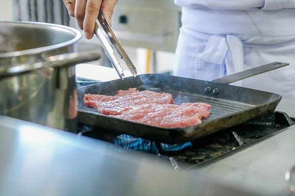 Trong quá trình chế biến, bạn hãy nhấn mạnh thịt xuống chảo để các mặt được chín đều.