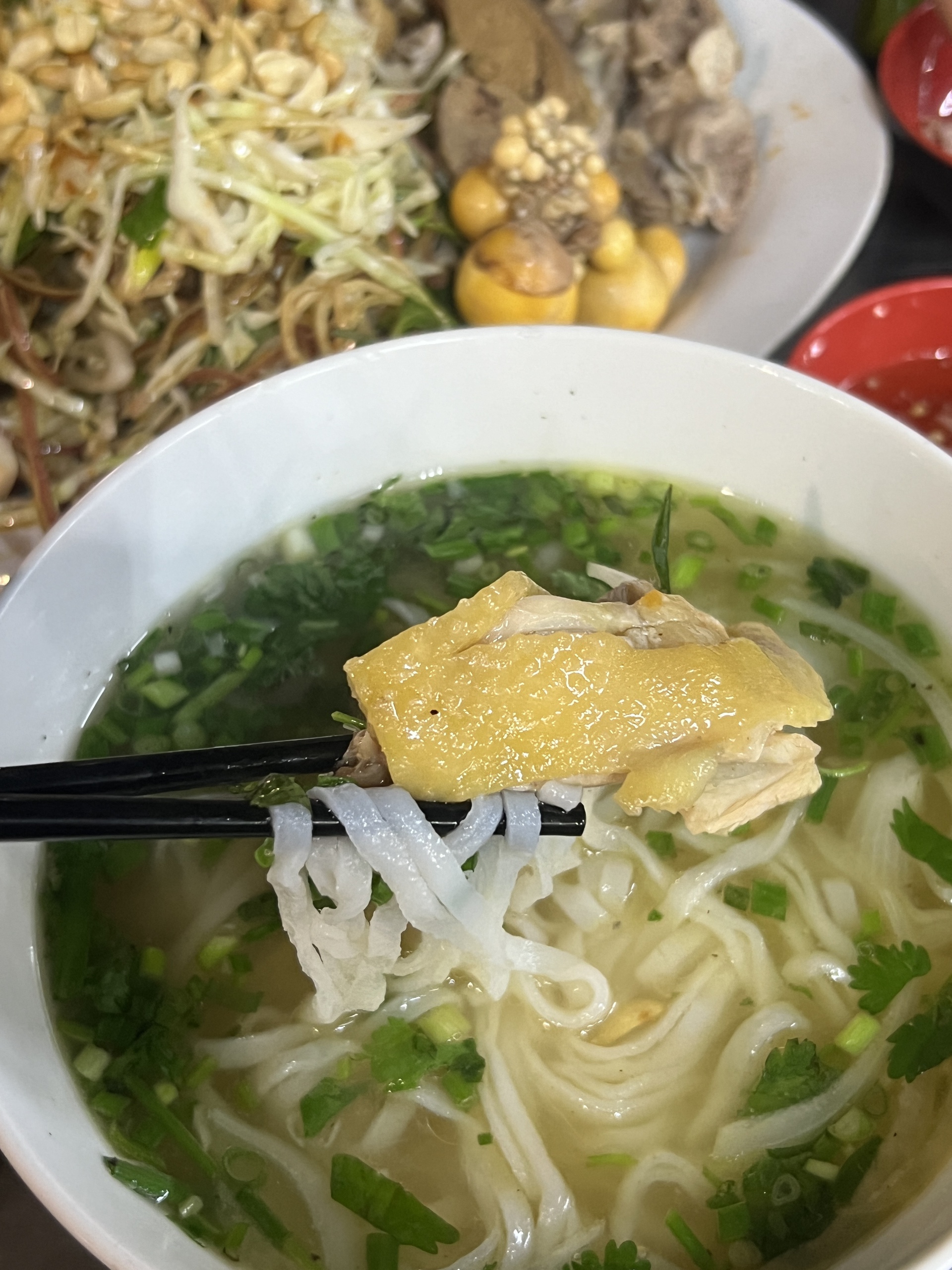 Bên cạnh đó, phở và cơm cũng khá đặc biệt, nhất là với những ai mới ăn lần đầu. Phở có nước dùng ngọt béo được ninh từ xương gà. Cơm ở đây sử dụng loại gạo hạt dài khá độc đáo, ăn ngon và cũng lạ miệng. Đặc biệt, cơm được nấu với nước luộc gà nên ăn béo ngậy và có độ ngọt nhất định.