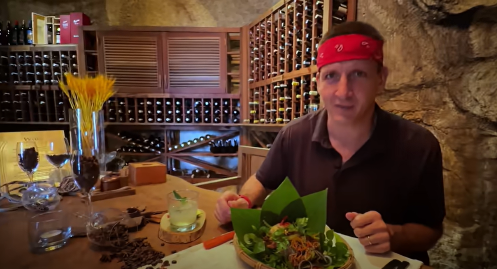 Anh cũng không quên trải nghiệm bữa tối đặc biệt ở nhà hàng trong hầm rượu với giá 410 USD (hơn 10 triệu đồng) và thưởng thức một số món ăn hấp dẫn như bò lá lốt, gỏi gà đen… Vị khách tỏ ra hài lòng với bữa ăn ngon miệng và khen thiết kế lãng mạn, độc đáo của nhà hàng có vị trí đặc biệt này.