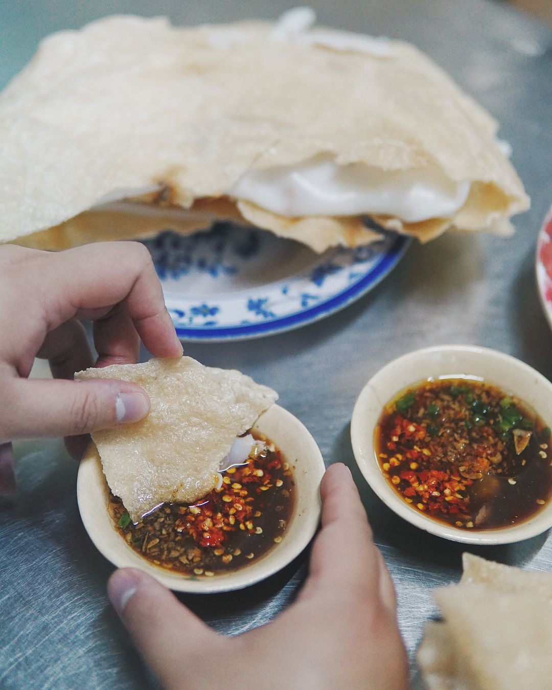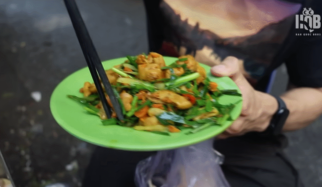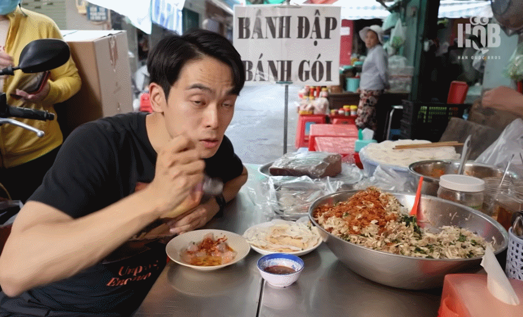 Tiếp đến, Jongrak ghé một quán ăn cách đó không xa để thưởng thức món bánh đa xúc hến và lòng xào nghệ. Anh đánh giá hai món đều hợp khẩu vị, tuy nhiên món bánh đa xúc hến được nêm nếm hơi cay, còn lòng xào nghệ “là món người Hàn Quốc chắc chắn sẽ thấy dễ ăn”.