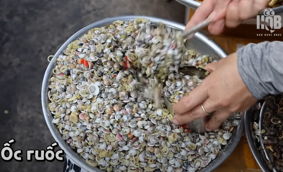 Điểm đến cuối cùng của anh trong chuyến foodtour chợ Bà Hoa là quầy hàng bán ốc ruốc. Ốc ruốc (hay còn có các tên gọi khác như ốc lể, ốc gạo,…) là loại ốc quen thuộc với người dân miền Trung, được tìm thấy nhiều ở một số tỉnh thành ven biển như Đà Nẵng, Quảng Nam, Quảng Ngãi, Bình Định,…