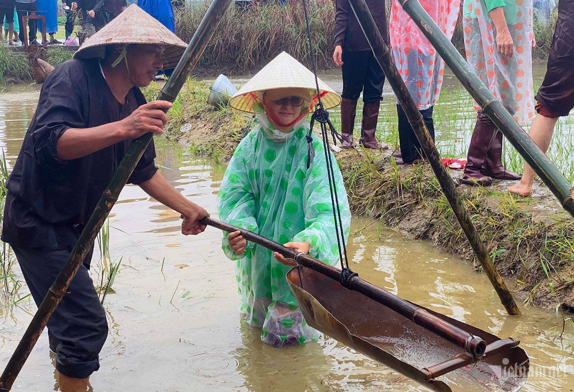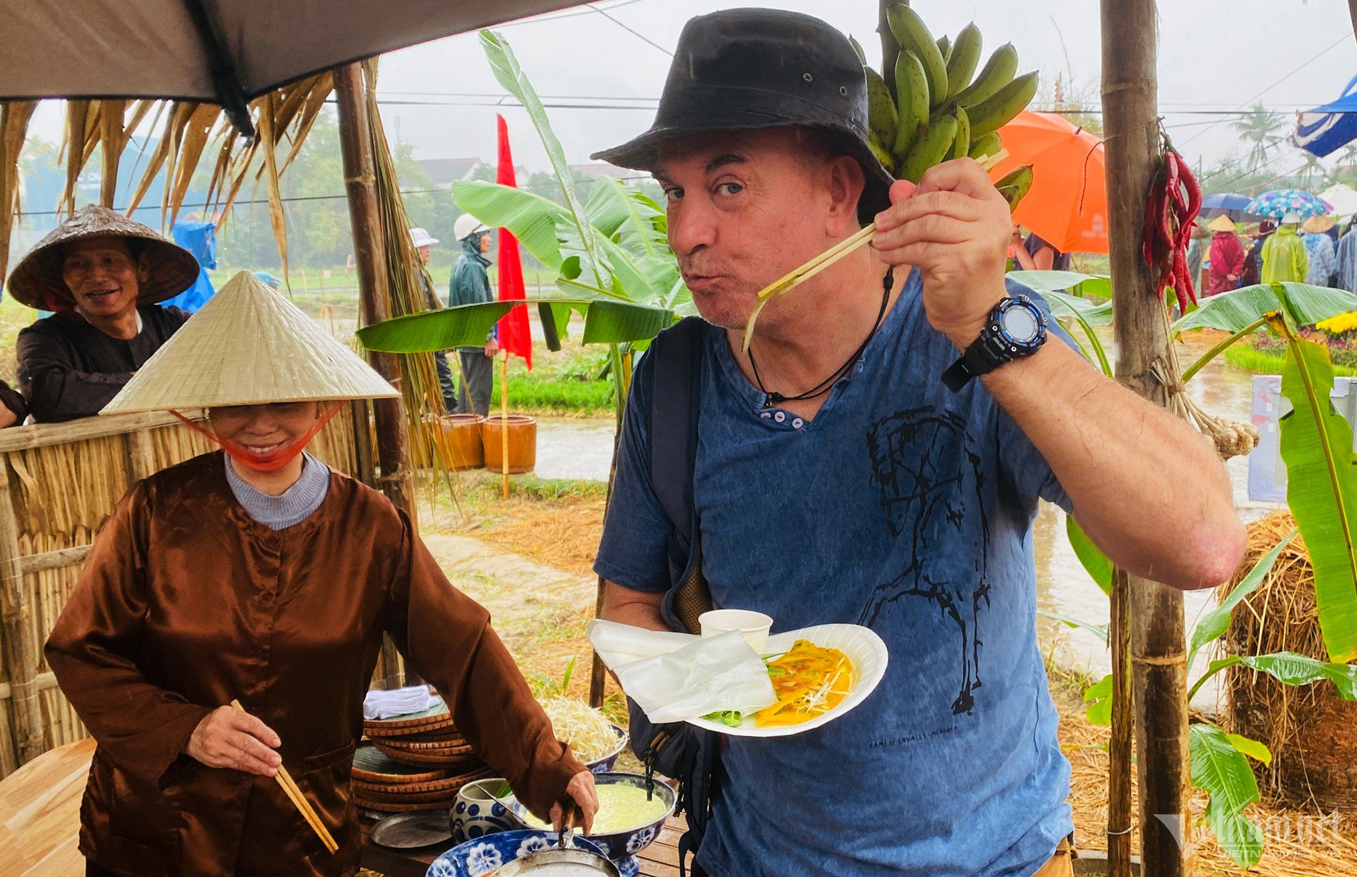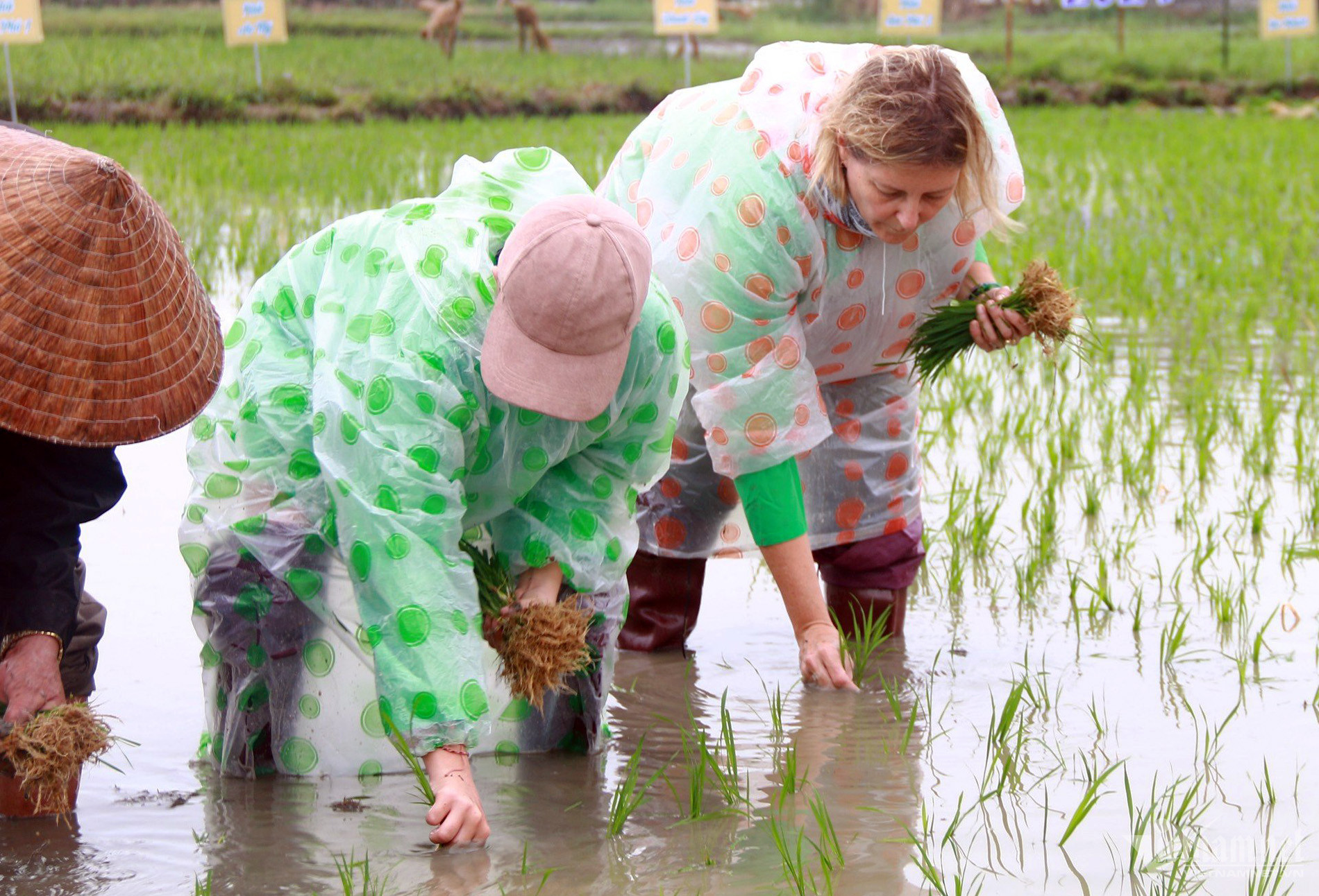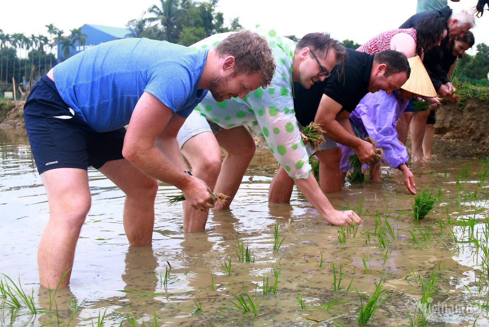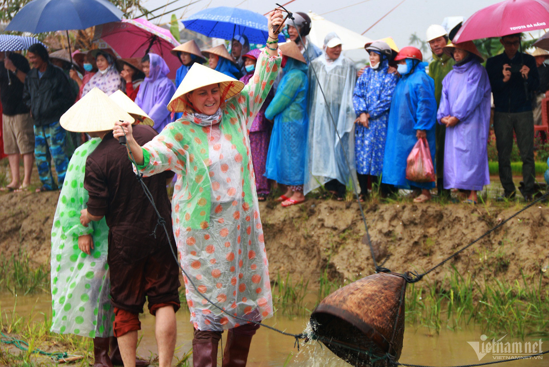 Nhiều du khách nước ngoài đội mưa, cưỡi trâu cày ruộng, cấy lúa trong lễ hội xuống đồng tại Hội An.
