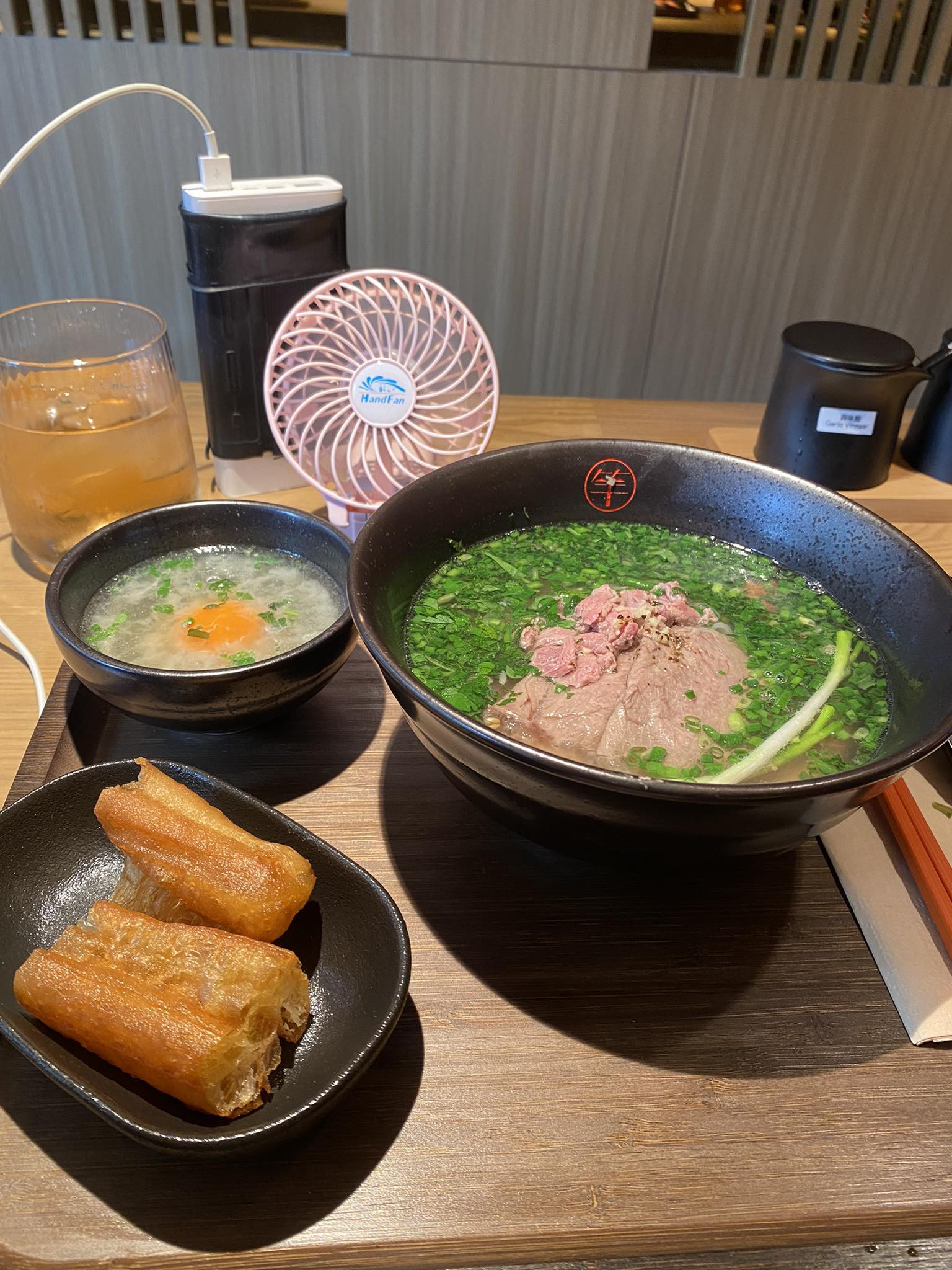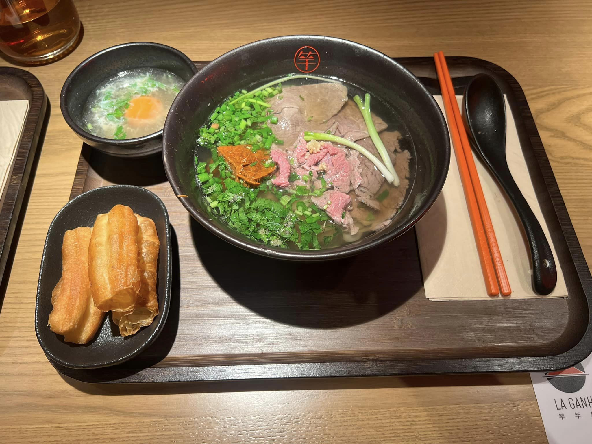Linh cho biết, cô đến vào hôm khai trương nên quán khá đông. Linh gọi combo bao gồm nước, phở và quẩy, giá ưu đãi là 59 tệ (hơn 200.000 đồng). Được biết giá gốc combo này là 90 tệ (hơn 300.000 đồng). Hiện tại, thực đơn quán chỉ bao gồm một món phở, hai món ăn kèm là trứng trần và quẩy cùng thức uống chính là trà sen.