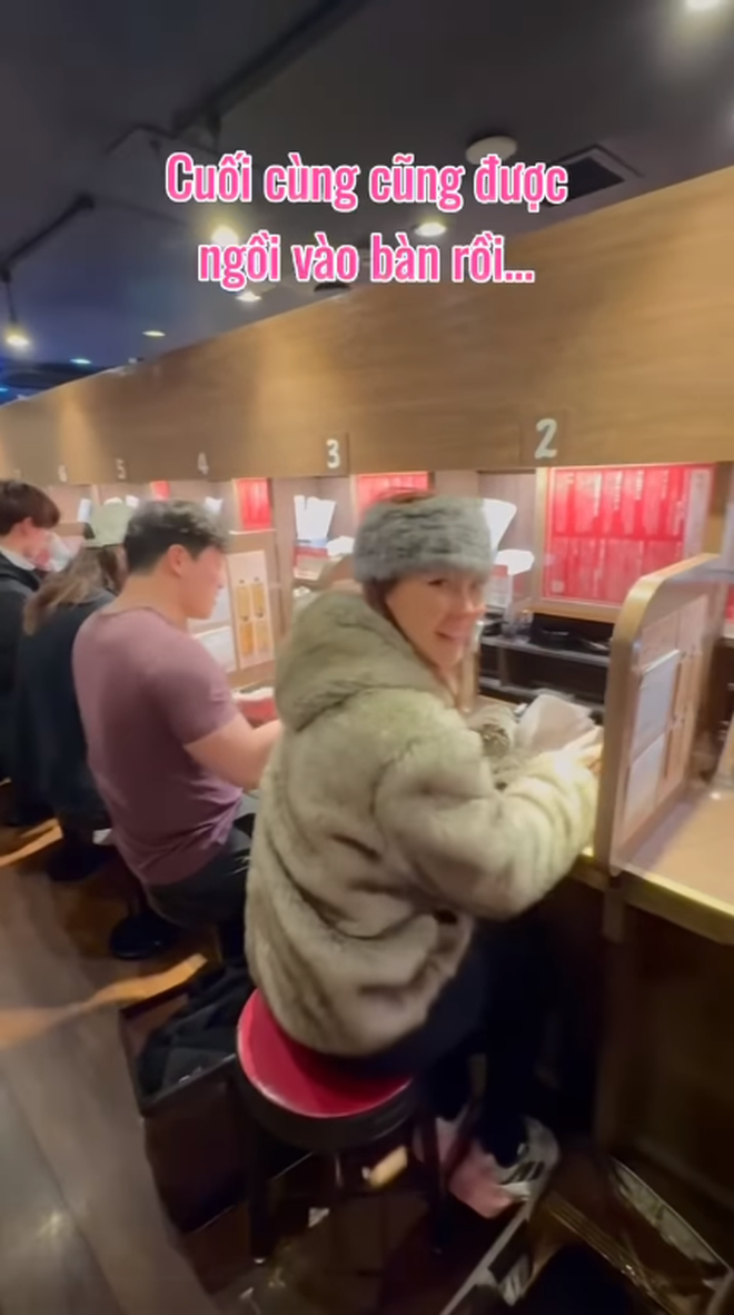 Khi vào được tới bên trong quán, nữ du khách còn bất ngờ hơn nữa bởi việc chờ đợi tới đây chưa kết thúc. Cô tiếp tục phải xếp hàng đợi ở khu vực cầu thang và khu vực đợi bàn ngồi. Sau khoảng 45 phút, Diễm Trang cùng chồng của mình đã có được chỗ ngồi để thưởng thức bát mì ramen nóng hổi.