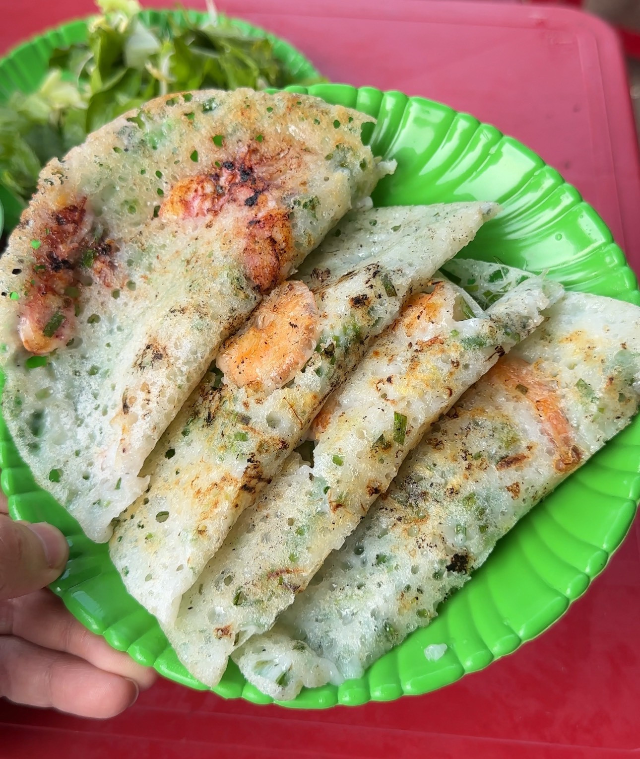 “Bánh xèo ở đây khá nhỏ, vỏ được đổ lớp bột dày và có độ mềm thay vì giòn rụm như bánh xèo miền Nam. Còn phần nhân có các loại hải sản tươi như tôm, mực. Bánh được ăn kèm với mắm nêm, chứ không phải nước mắm chua ngọt như nhiều nơi khác”, anh Lập nói.