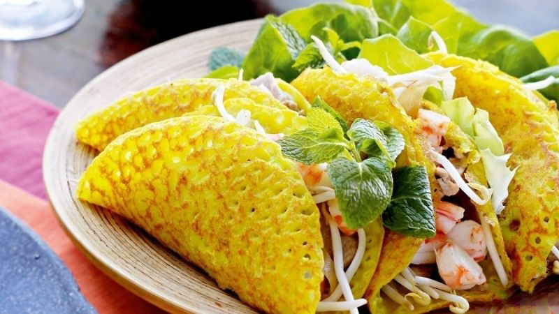 Bánh xèo: Bánh xèo chắc hẳn đã quá quen thuộc với tất cả mọi người, đây là một loại bánh chiên giòn được làm từ bột gạo, nước cốt dừa và nghệ. Bánh xèo thường có nhân là tôm, thịt heo, giá đỗ. Món này được ăn kèm với nước chấm từ nước mắm pha chanh, tỏi, ớt, đường và cuốn với rau sống. Bánh xèo có đầy đủ hương vị từ ngọt, chua, cay đến mặn. Tất cả đều rất hài hòa giúp tạo nên một hương vị khó quên.