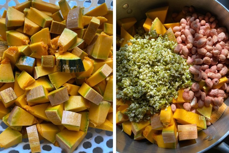 Bí đỏ rửa sạch, có thể gọt sạch vỏ hoặc không cần gọt vỏ, rửa sạch bí, cắt miếng nhỏ. Đậu xanh và đậu phộng rửa sạch.