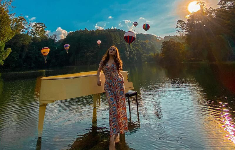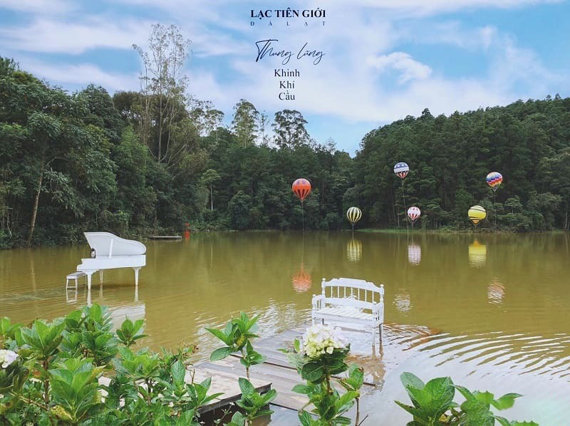 Khi đến với Lạc Tiên Giới sẽ có rất nhiều góc chụp đẹp dành cho bạn. Tại đây hồ nước được coi như là trung tâm và cũng là góc chụp mà nhiều du khách yêu thích nhất. Cùng với tiểu cảnh cây đàn piano trắng đặt trên mặt hồ thì chắc chắn bạn sẽ có những bức hình siêu chất