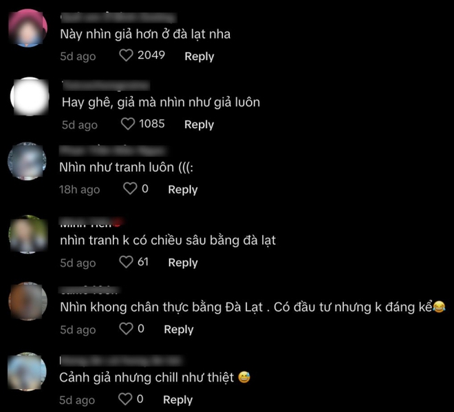 Ngay lập tức, những hình ảnh "Thuỵ Sĩ giữa lòng Sài Gòn" này cũng khiến dân mạng xôn xao. Trong đó, người xem dở khóc dở cười trước khung cảnh này. Các bình luận đều cho rằng chủ nhân địa điểm dù cố gắng nhưng kết quả có vẻ như không được giống với tưởng tượng. Khung cảnh Thuỵ Sĩ này nhìn quá giả so với hình ảnh Thuỵ Sĩ giữa lòng Đà Lạt đang viral trên mạng xã hội.