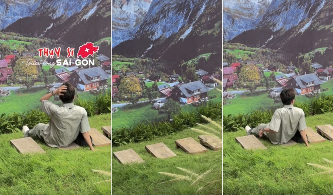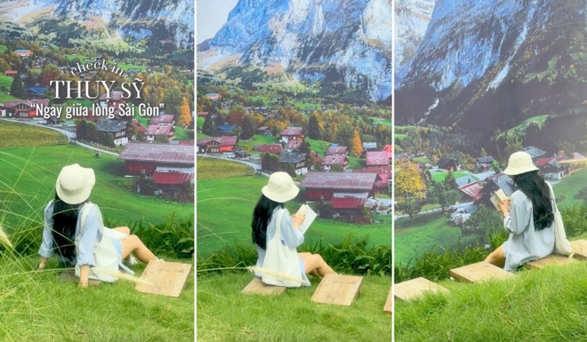 Vẫn với cách làm tương tự, địa điểm này đã dựng một tấm phông in tranh là khung cảnh của Thuỵ Sĩ ngay trước một bãi cỏ cho khách tới chụp ảnh, check-in. Tuy nhiên, dù cùng cách làm nhưng kết quả lại rất khác biệt. Nguyên nhân đến từ chính tấm tranh này, thay vì in cảnh cây cối, núi non, bãi cỏ thì chủ nhân địa điểm này lại lựa chọn khung cảnh có rất nhiều nhà cửa. Điều đó khiến cho người xem phát hiện ra hơn và hình ảnh cũng không được đẹp bằng những hình ảnh đang được lan truyền trên mạng xã hội trước đó.