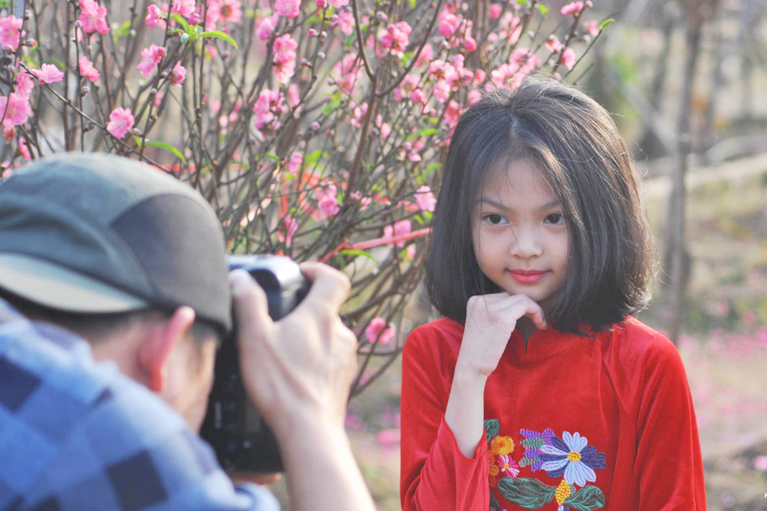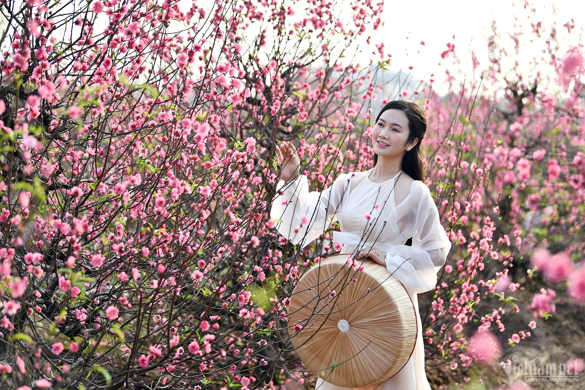 Gần 10 năm nay, anh Doãn Bách (Hà Nội), một người đam mê nhiếp ảnh luôn dành thời gian ghé thăm làng đào Nhật Tân mỗi dịp cận Tết. Bộ ảnh được anh thực hiện vào chiều 26 Tết. Thời điểm này, những vườn đào bung nở, khoe sắc hồng tươi rực rỡ. Du khách khắp nơi đổ về chiêm ngưỡng, chụp ảnh.