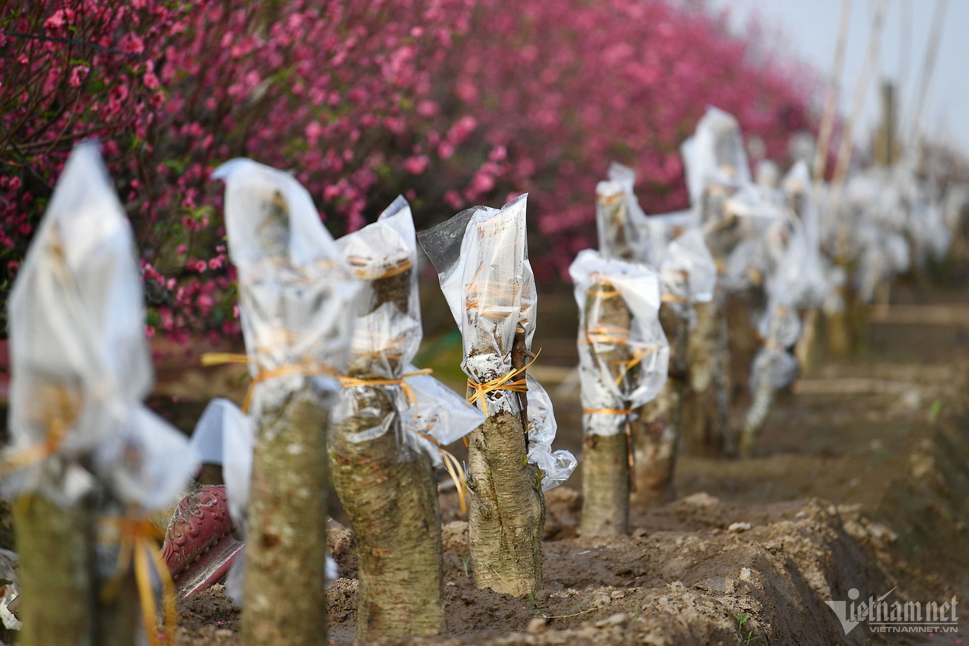 Sau Tết Táo quân, nhiều vườn đào đã tiêu thụ được rất nhiều cây, chỉ còn lại gốc. Người nông dân sớm bao bọc, chăm sóc để chuẩn bị cho mùa vụ của năm sau.