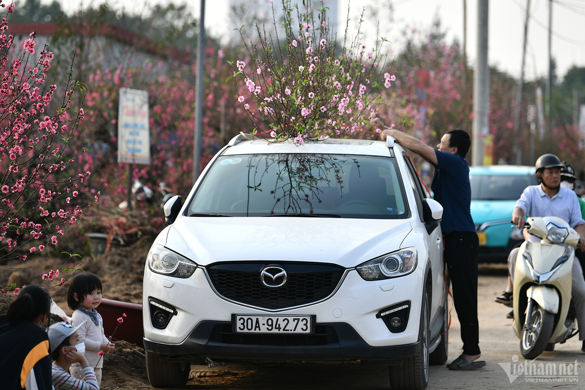 Thời điểm này, nhiều người lái ô tô lên vườn Nhật Tân để có thể thoải mái chọn được cành đào ưng ý. Tuy nhiên, số lượng đào đẹp đã được khách đặt trước khá nhiều, giá cả cũng không rẻ hơn so với mua tại chợ trên phố.