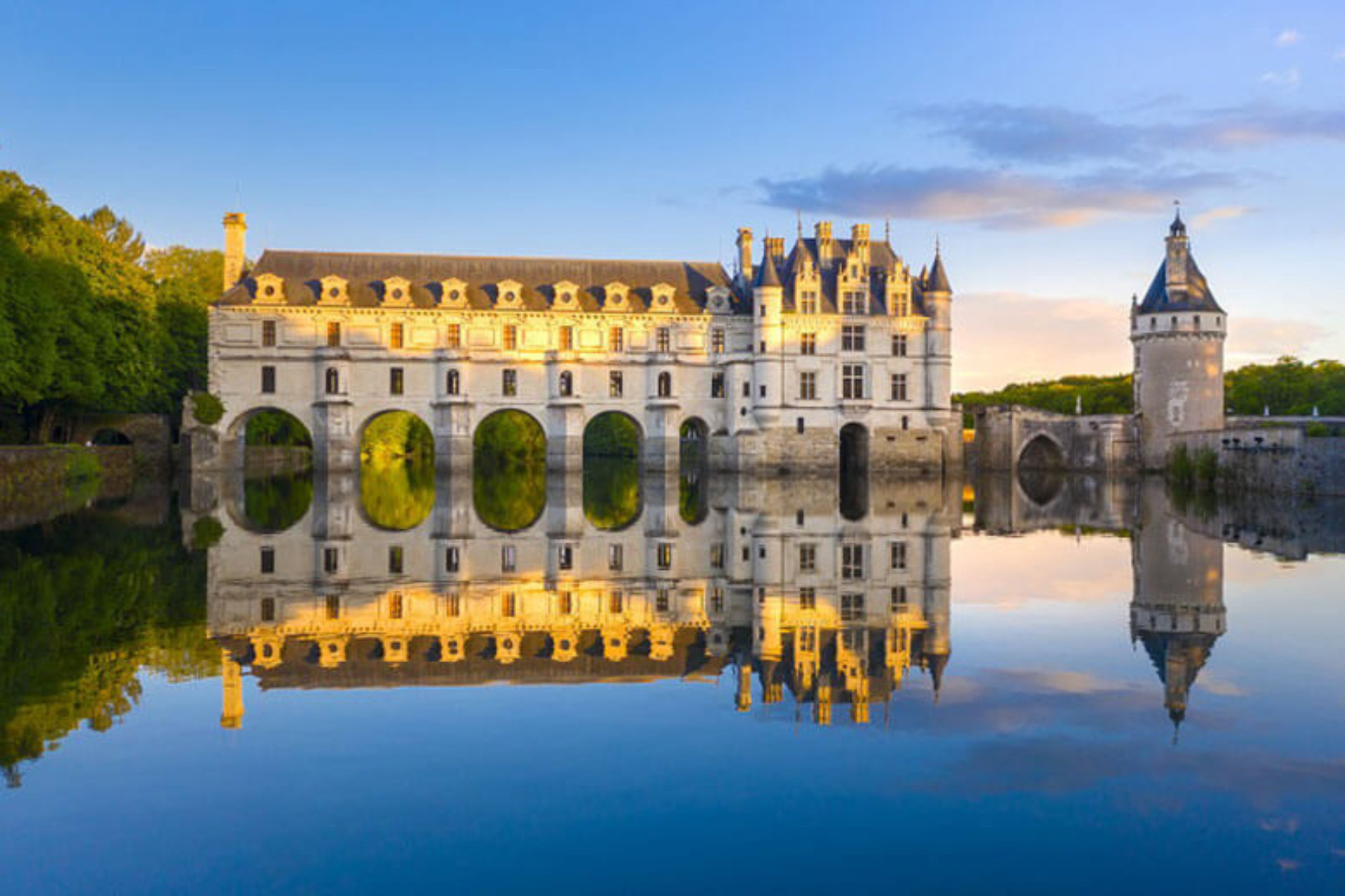 Bất cứ ai khi đến thăm lâu đài Chenonceau đều có cảm giác như lâu đài đang bồng bềnh trên mặt nước nhờ thiết kế “độc lạ” và vị trí đẹp như tranh vẽ của nó. Lâu đài được xây dựng bằng cách “bắc cầu” qua sông Cher ở miền Trung nước Pháp. Ngắm nhìn mặt tiền bằng đá trắng xa hoa, mái đá phiến màu xám và những mái vòm kỳ vỹ phản chiếu dưới làn nước xanh trong của dòng sông, du khách như chìm đắm trong không gian đầy mê hoặc của lâu đài.