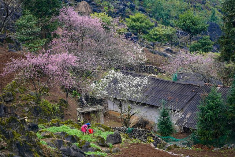 Một trong những điểm du lịch mùa xuân hấp dẫn ở miền Bắc nhất định không thể bỏ qua chính là Hà Giang. Hà Giang đón xuân bằng màu hoa đào nhuốm hồng cả cao nguyên đá, đâu đó là những cành mận cũng bắt đầu bung nở khoe sắc trắng tinh khôi. Lên Hà Giang dịp này, du khách có dịp tham gia vào các trò chơi dân gian và ăn những món ngon truyền thống của người Mông, người Dao bên bếp lửa hồng ấm cúng.