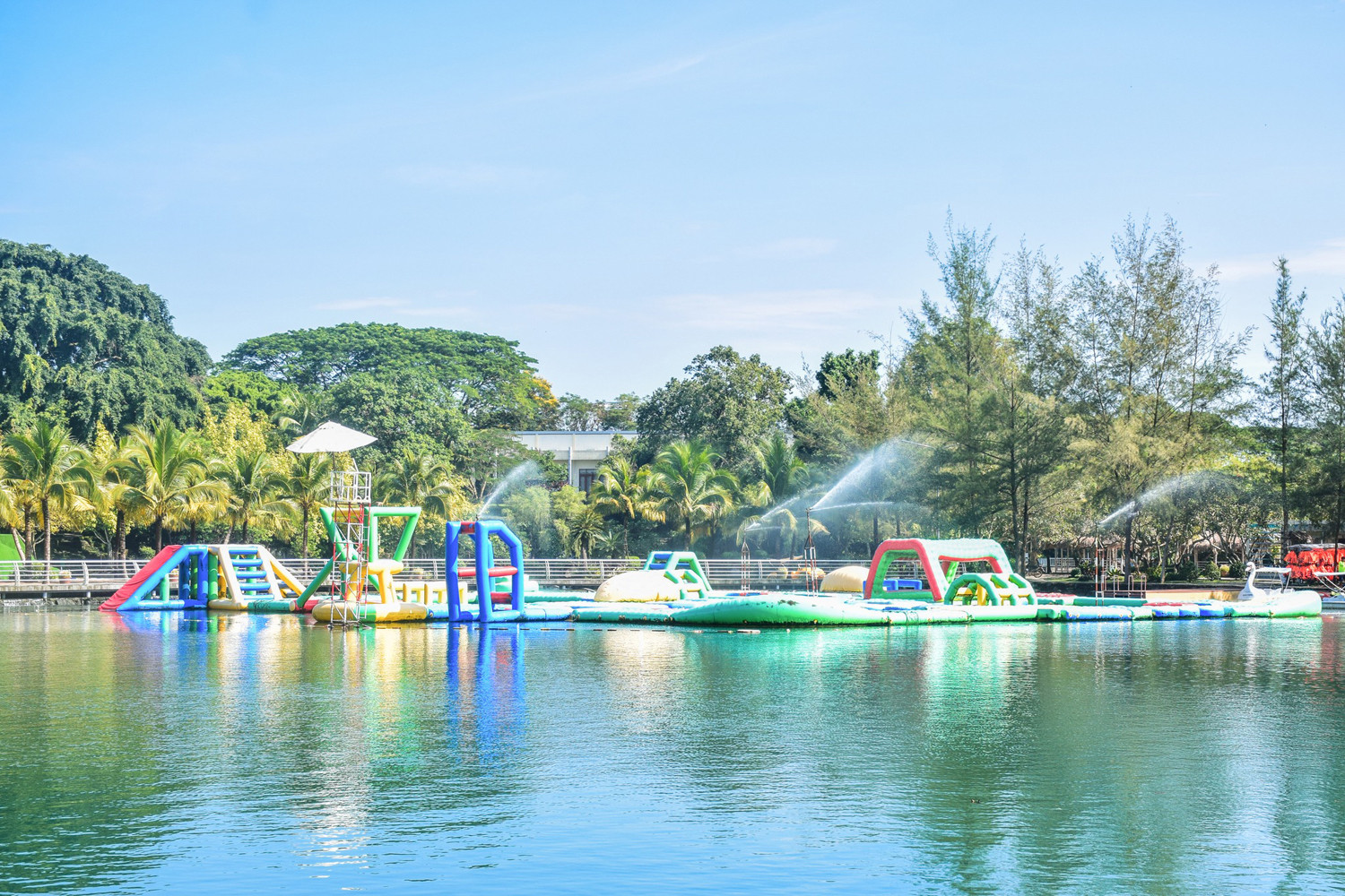 Đến đây, du khách không khỏi ấn tượng với thiết kế thác nước cao cùng cây xanh tự nhiên, không gian mát mẻ mà còn có cơ hội tham gia nhiều hoạt động ngoài trời thú vị như chèo SUP, chơi mô tô nước - đạp vịt, trải nghiệm nhà phao liên hoàn, massage cá,…
