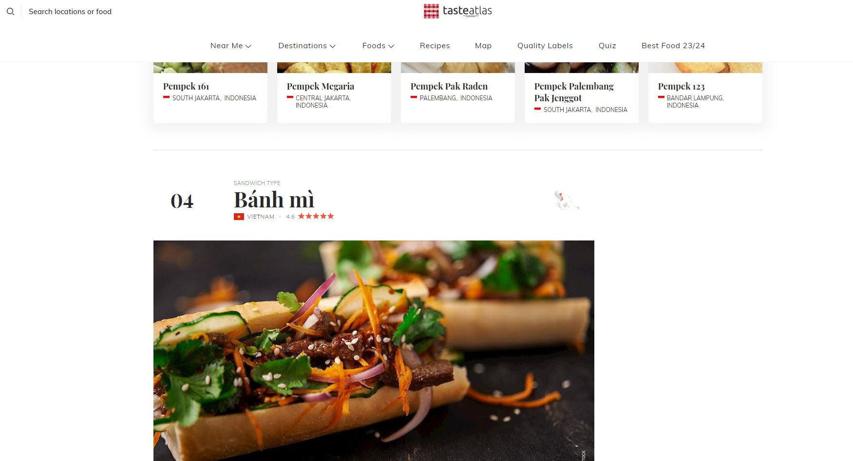 Theo đó, trong danh sách của chuyên trang nổi tiếng, bánh mì (thứ 4) là món Việt được xếp hạng cao nhất. Trang này ca ngợi bánh mì là "di sản" của nền ẩm thực Việt. Taste Atlas nhận định ở mỗi vùng miền, bánh mì của Việt Nam lại có phần nhân mang hương vị khác nhau nhưng điểm chung là đều được kẹp trong những chiếc bánh mì baguette kiểu Pháp vàng giòn.