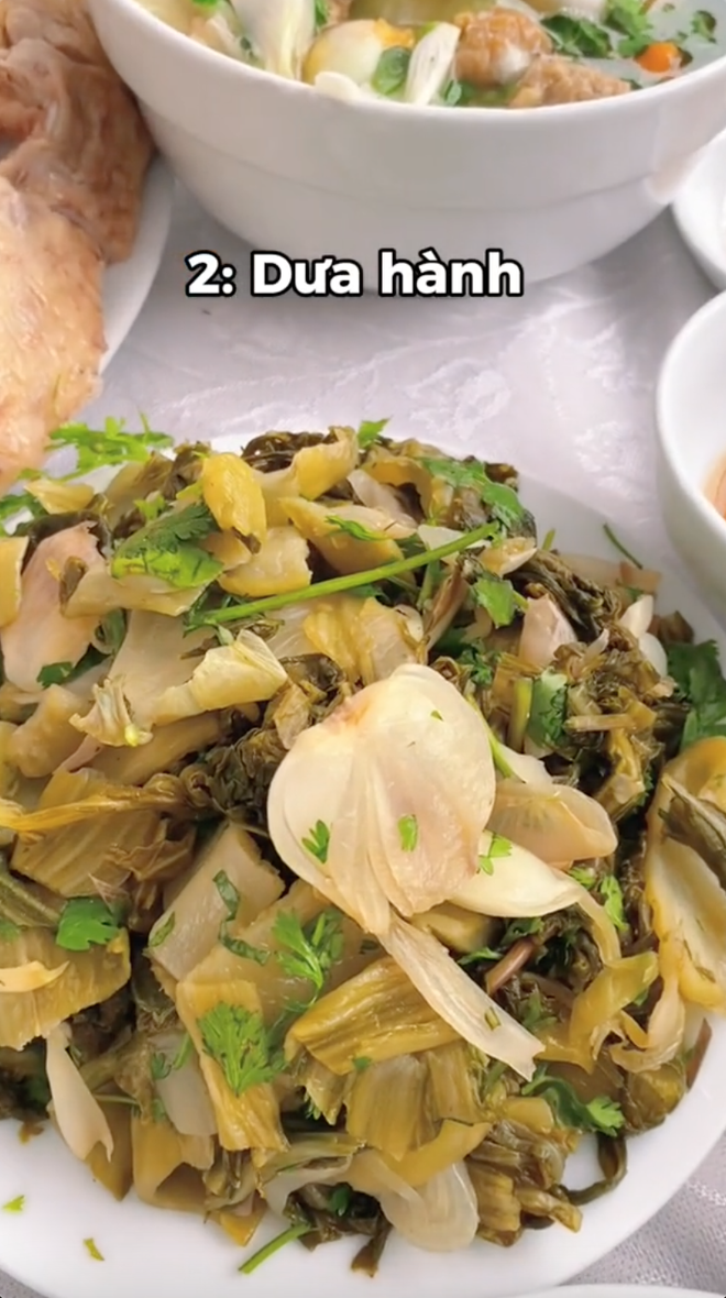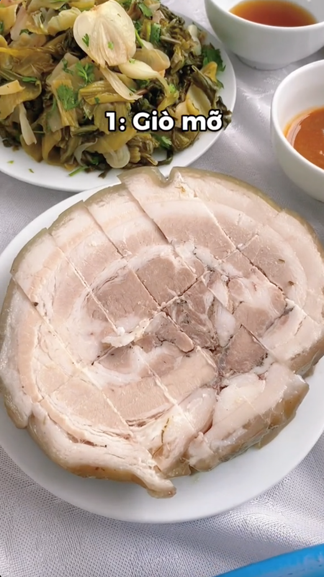 Có thể thấy, bên cạnh những món quen thuộc như thịt gà, tôm, giò lụa, xôi, hoa quả tráng miệng... thì mâm cỗ cưới ở Đông Hưng, Thái Bình này còn có những món khá độc đáo như giò mỡ, dưa xào hành, thịt trâu xào rau cần, chân giò hầm thảo mộc... Đây tuy không phải những món quá lạ lẫm nhưng không phải cỗ cưới ở đâu cũng có.