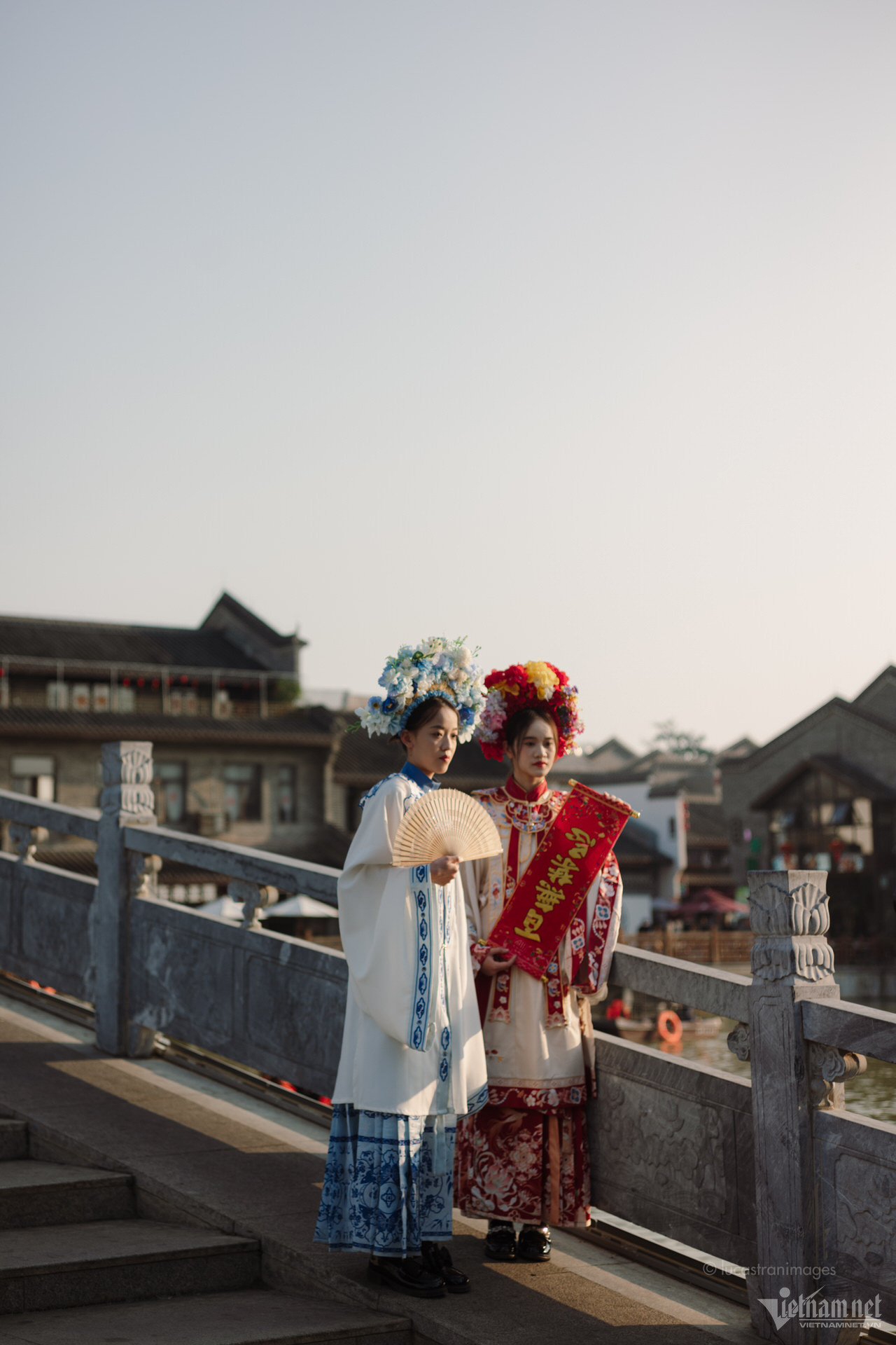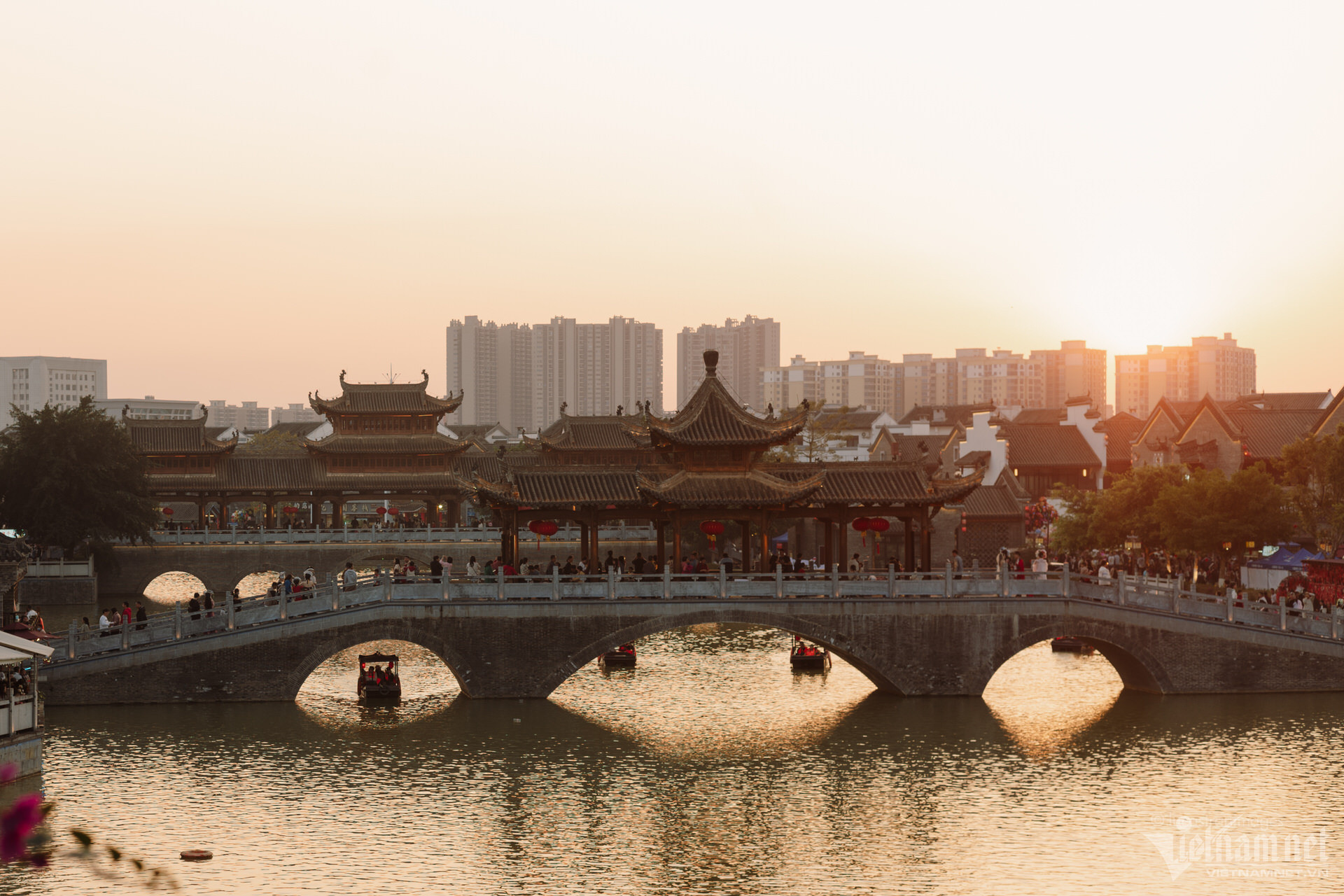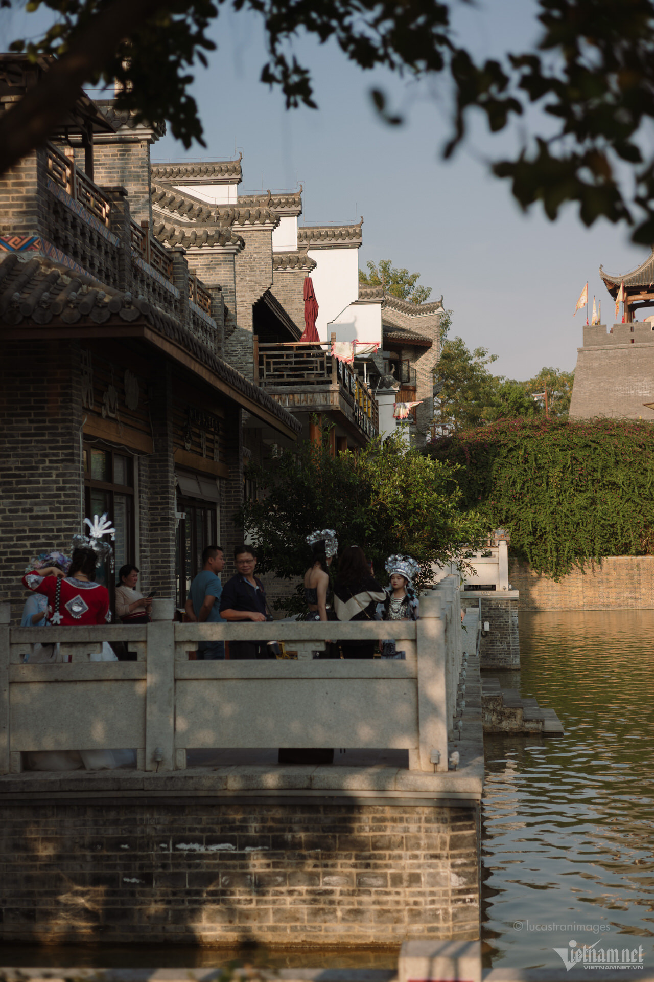 Du khách cũng có thể ngồi thuyền đi dạo trên sông để ngắm nhìn toàn cảnh cổ trấn xinh đẹp, hay thuê những bộ trang phục dân tộc được may cầu kì, rực rỡ để chụp ảnh, check-in.