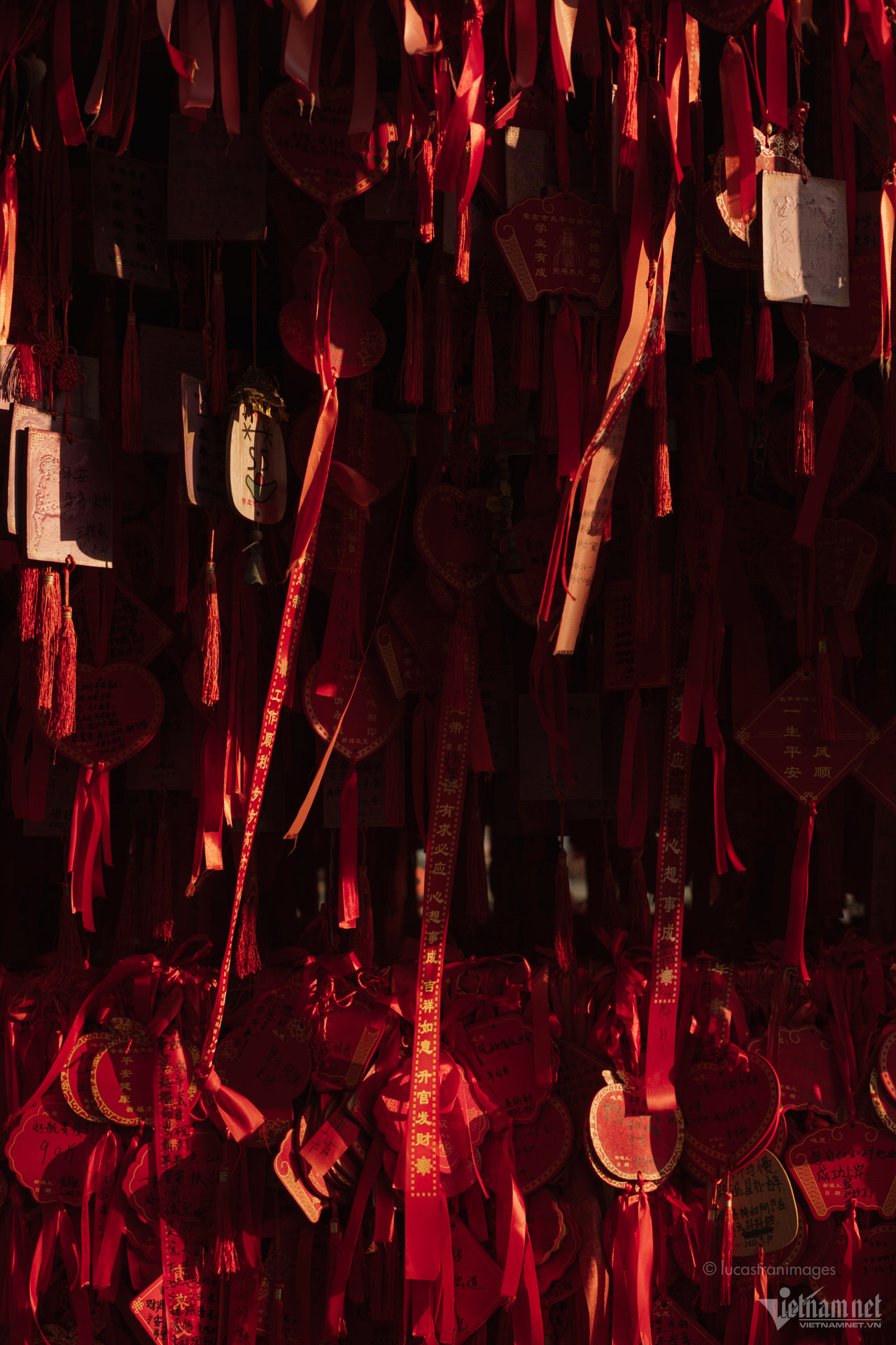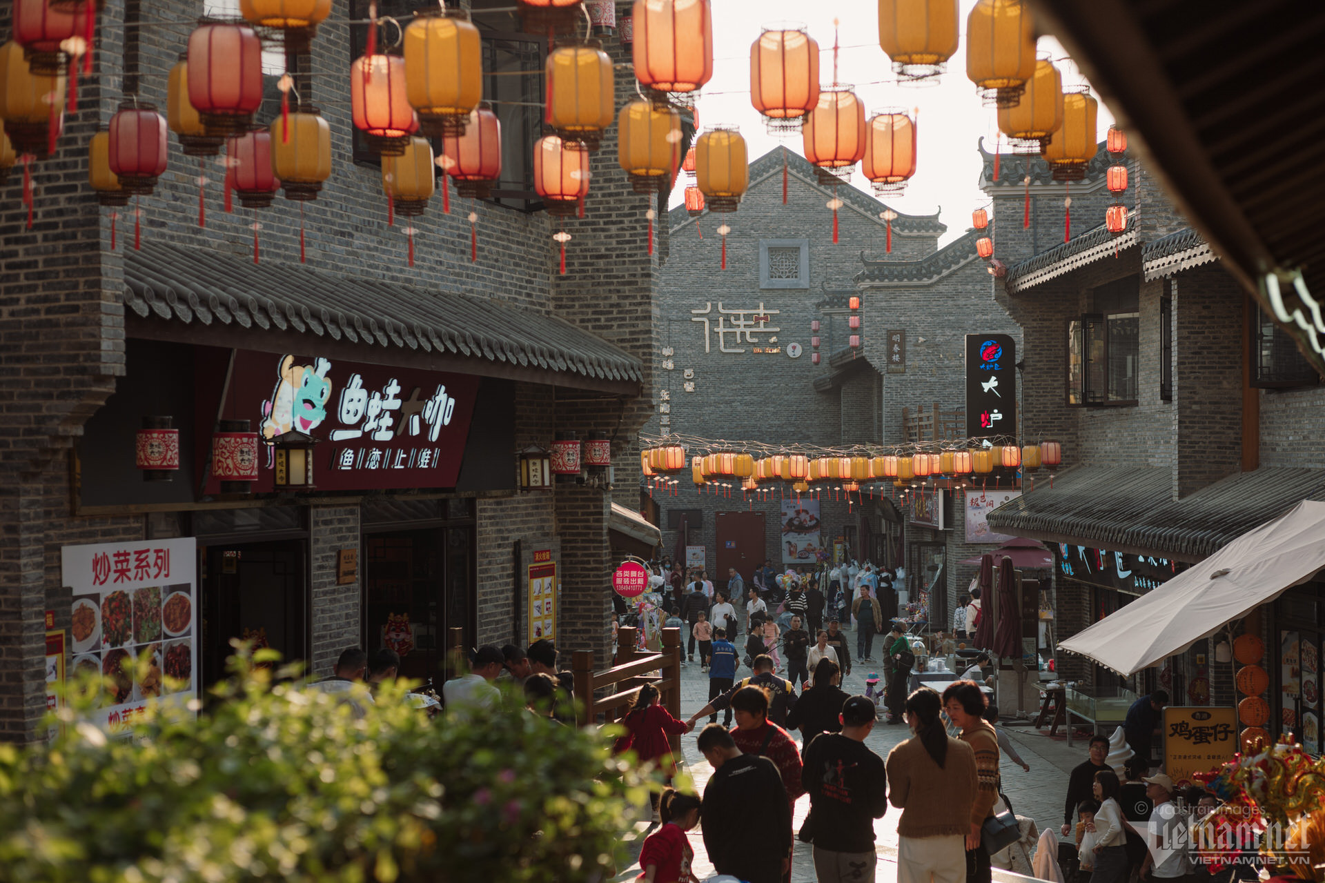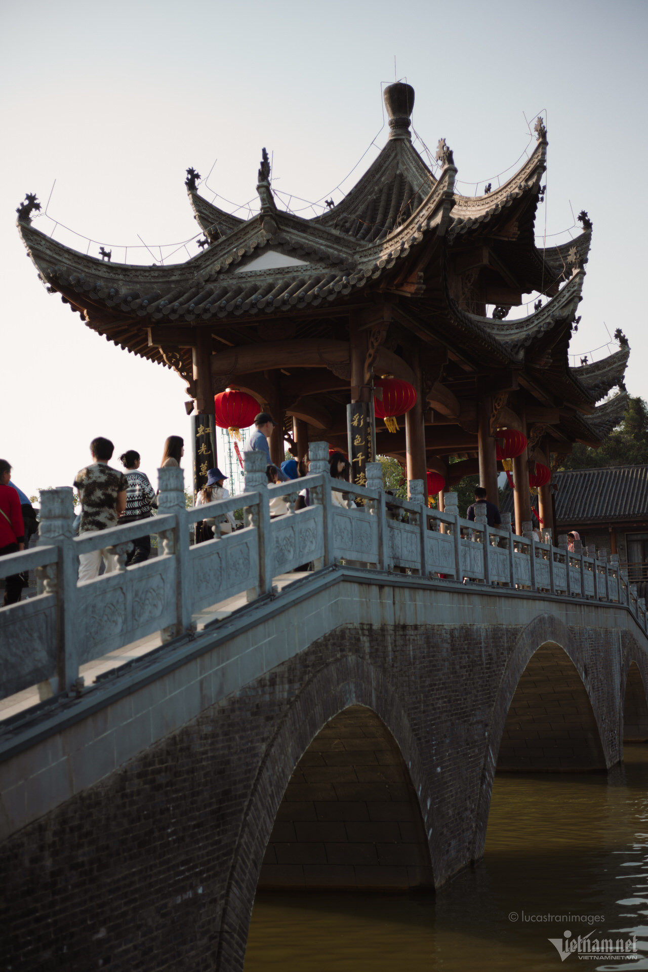 Du khách có thể thong thả đi bộ dọc theo các con phố cổ, ngắm nhìn những chiếc đèn lồng rực rỡ. Trong dịp đầu năm mới, cổ trấn như bừng sáng hơn bởi sắc đỏ của đèn lồng, của những chiếc bùa cầu phúc, cầu may được treo ở khắp nơi.