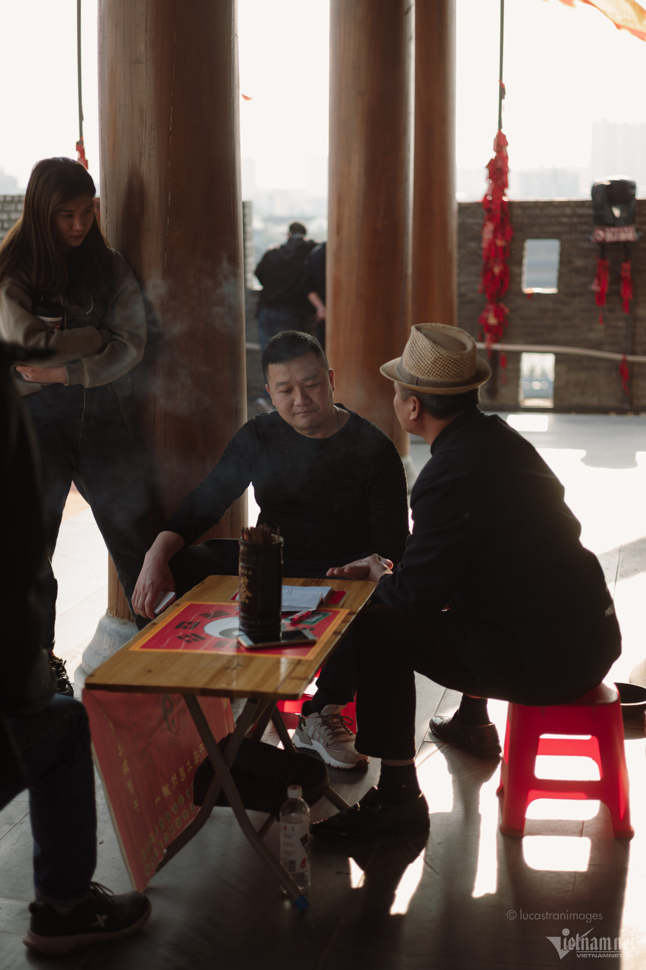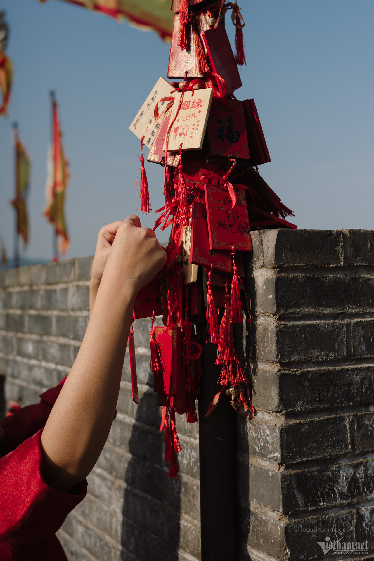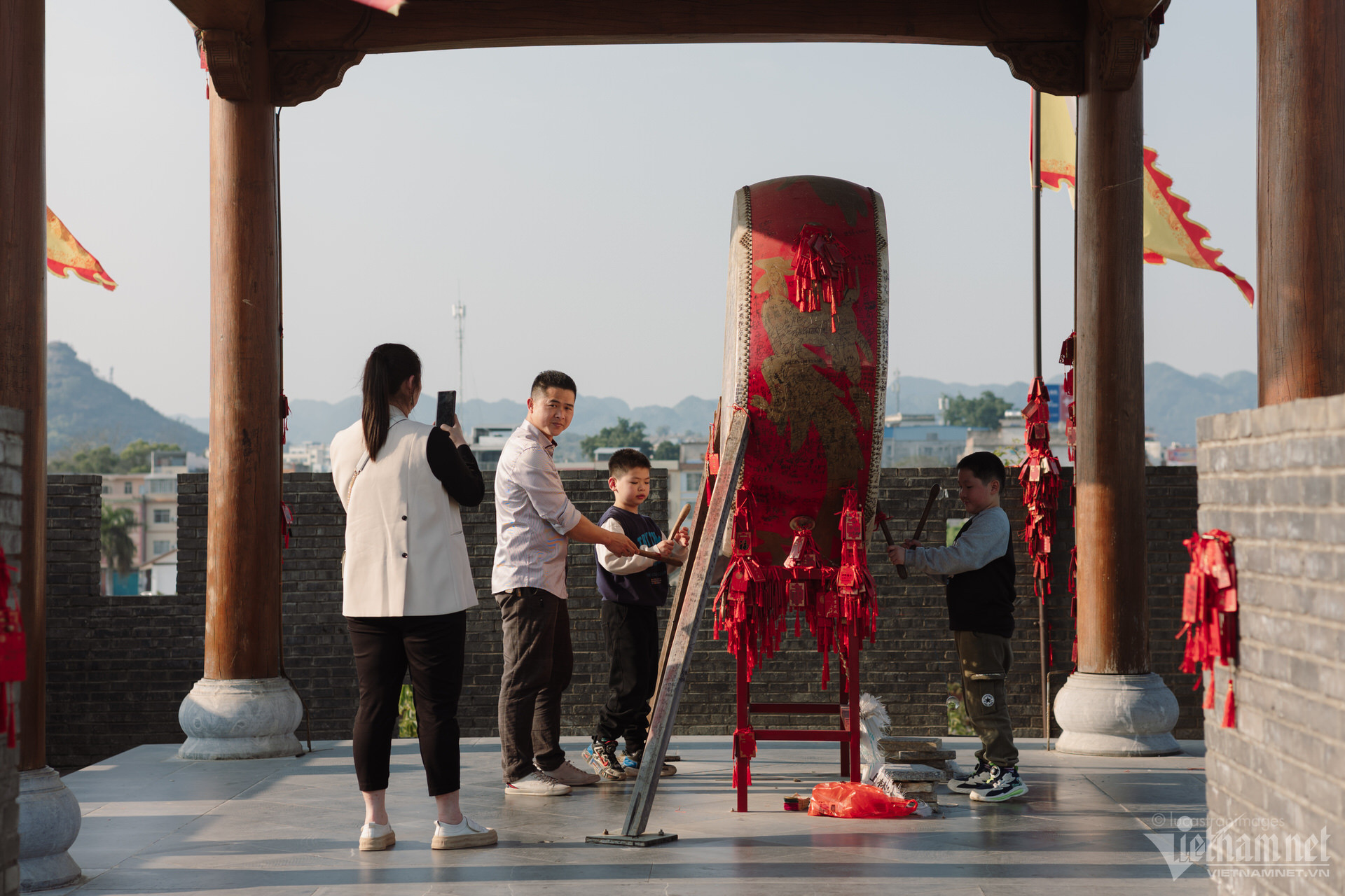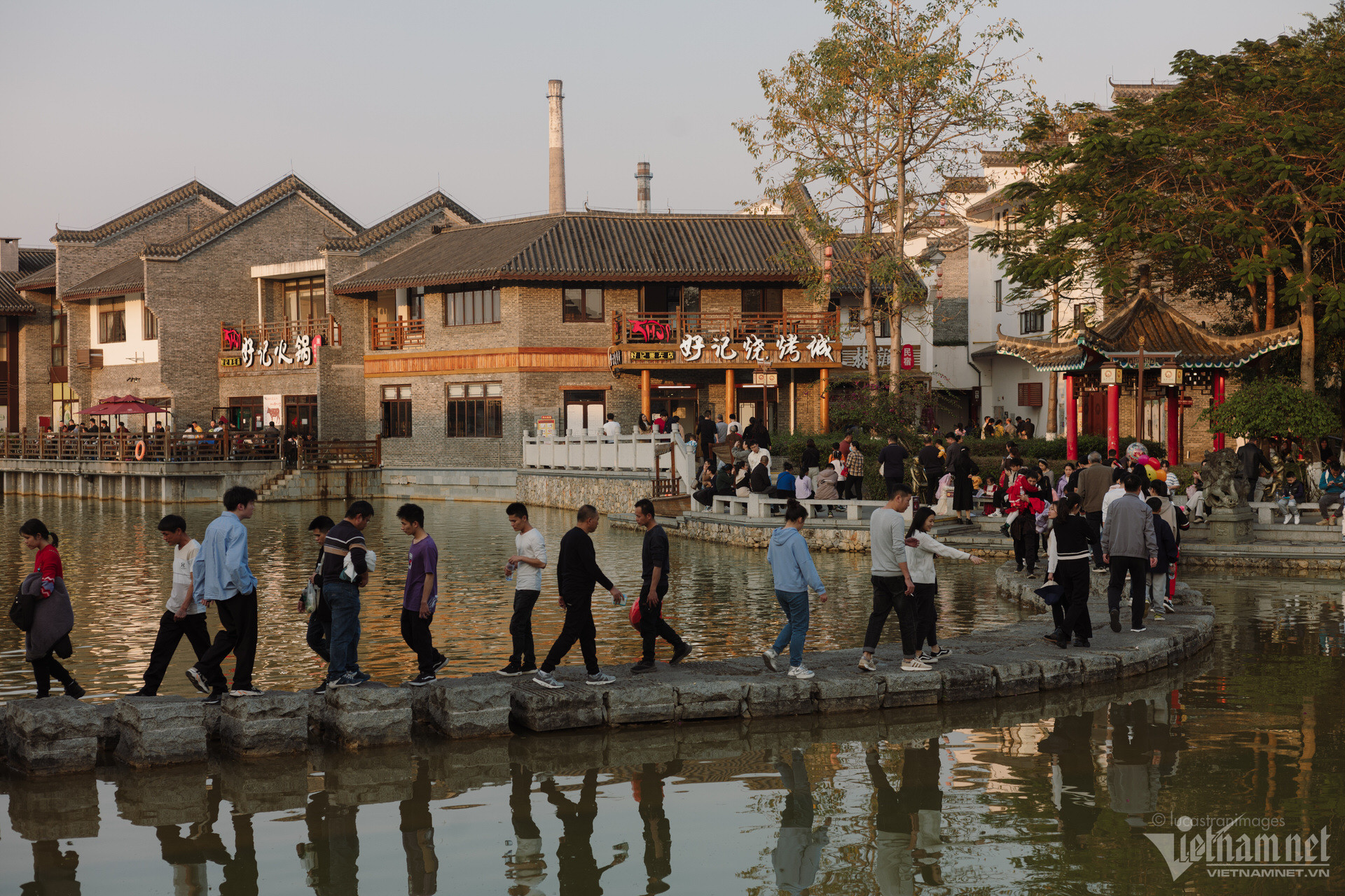 Du khách có thể thong thả đi bộ dọc theo các con phố cổ, ngắm nhìn những chiếc đèn lồng rực rỡ. Trong dịp đầu năm mới, cổ trấn như bừng sáng hơn bởi sắc đỏ của đèn lồng, của những chiếc bùa cầu phúc, cầu may được treo ở khắp nơi.
