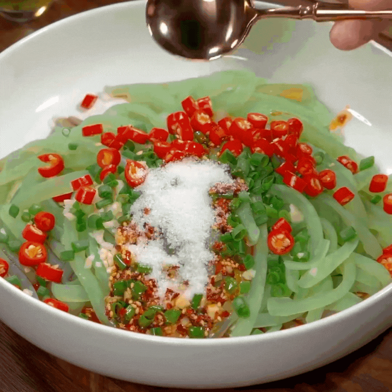 Bước 4: Cho sợi mì lạnh vào bát to, thêm tỏi băm, hành xanh, nước tương, giấm táo, muối, đường, hạt nêm, rau mùi. Trộn đều và để mì lạnh ngấm khoảng 5 phút là được.