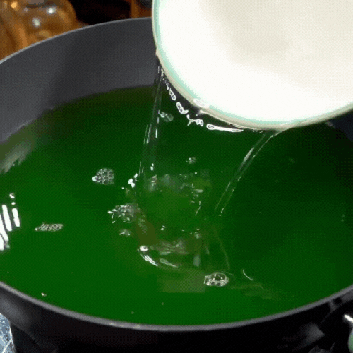 Bước 2: Đổ phần nước cốt vỏ dưa chuột vào chảo. Cho thêm vào đó 1 hoặc 2 lít nước phụ thuộc vào độ đậm nhạt của thành phẩm sợi mì lạnh bạn muốn. Cho tiếp tinh bột đậu xanh vào, khuấy từ từ để không vón cục.