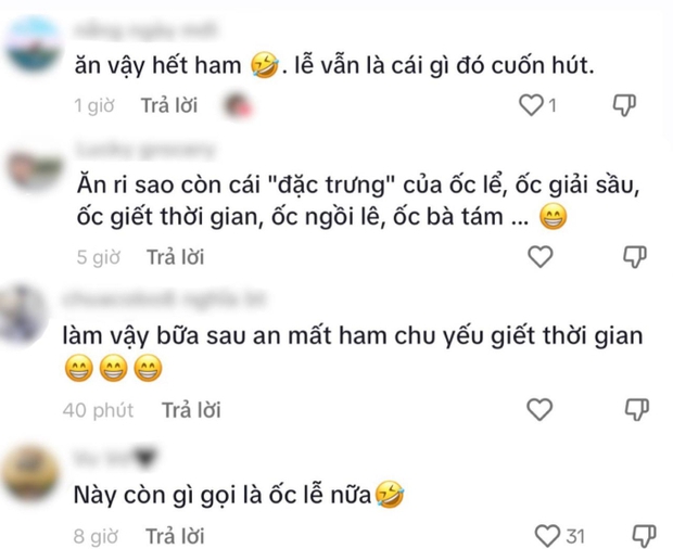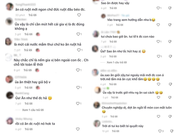 Dưới phần bình luận, không ít người cho rằng cách ăn của cô gái này chỉ có thể nếm được phần gia vị chứ không thể ăn được phần thịt bên trong. Bên cạnh đó, nhiều người bày tỏ sự ngạc nhiên vì không ngờ ốc lễ còn có cách ăn nhanh gọn như thế này.