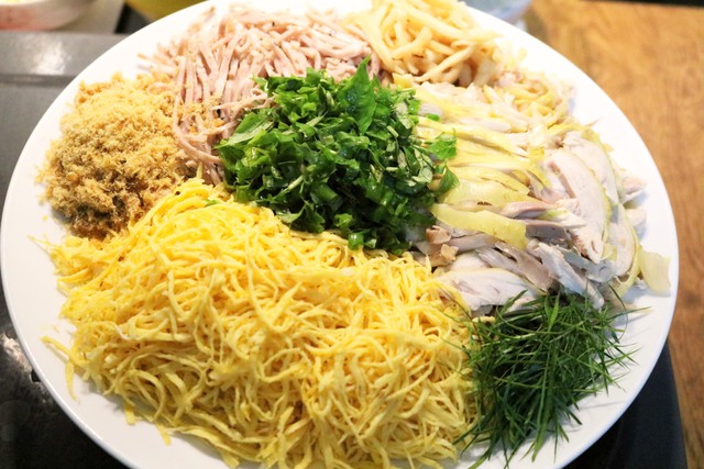 - Thái đồ ăn kèm: Thịt gà, giò nạc, trứng và các loại rau nên thái thành sợi mỏng, đều nhau để dễ ăn và đẹp mắt.