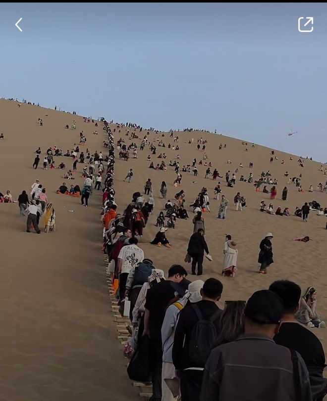 Một du khách khác ở Cam Túc khi đến trải nghiệm du lịch ở tại núi Mingsa, Thị trấn cát Đôn Hoàng với con đường tơ lụa đi vào sử sách đã quay lại cảnh tượng con đường lên núi rơi vào tình trạng ùn tắc nghiêm trọng bởi lượng khách di chuyển quá đông: "Không "tắc" lạc đà nhưng "tắc" người... Cứ đi bộ được 2 bước lại chờ 5 phút."