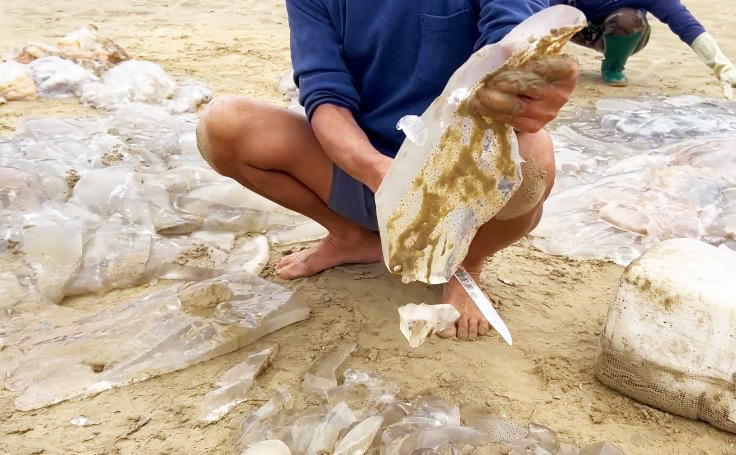 Những ngư dân đặt sứa xuống đất, dùng những con dao sắc lọc bỏ ruột, chỉ lấy thân và chân sứa. Từng miếng sứa mềm như thạch được cắt "ngọt xớt", vương đầy bãi cát.
