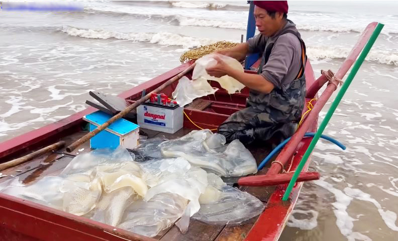 Theo ông Hà, mùa sứa rộ, một ngày thuyền có thể thu được cỡ 2 tấn sứa nếu trúng mánh. Sứa vớt lên cần được sơ chế ngay để đảm bảo độ tươi ngon, nên những người kinh doanh thường chờ cả ngày ở biển để đón thuyền về.