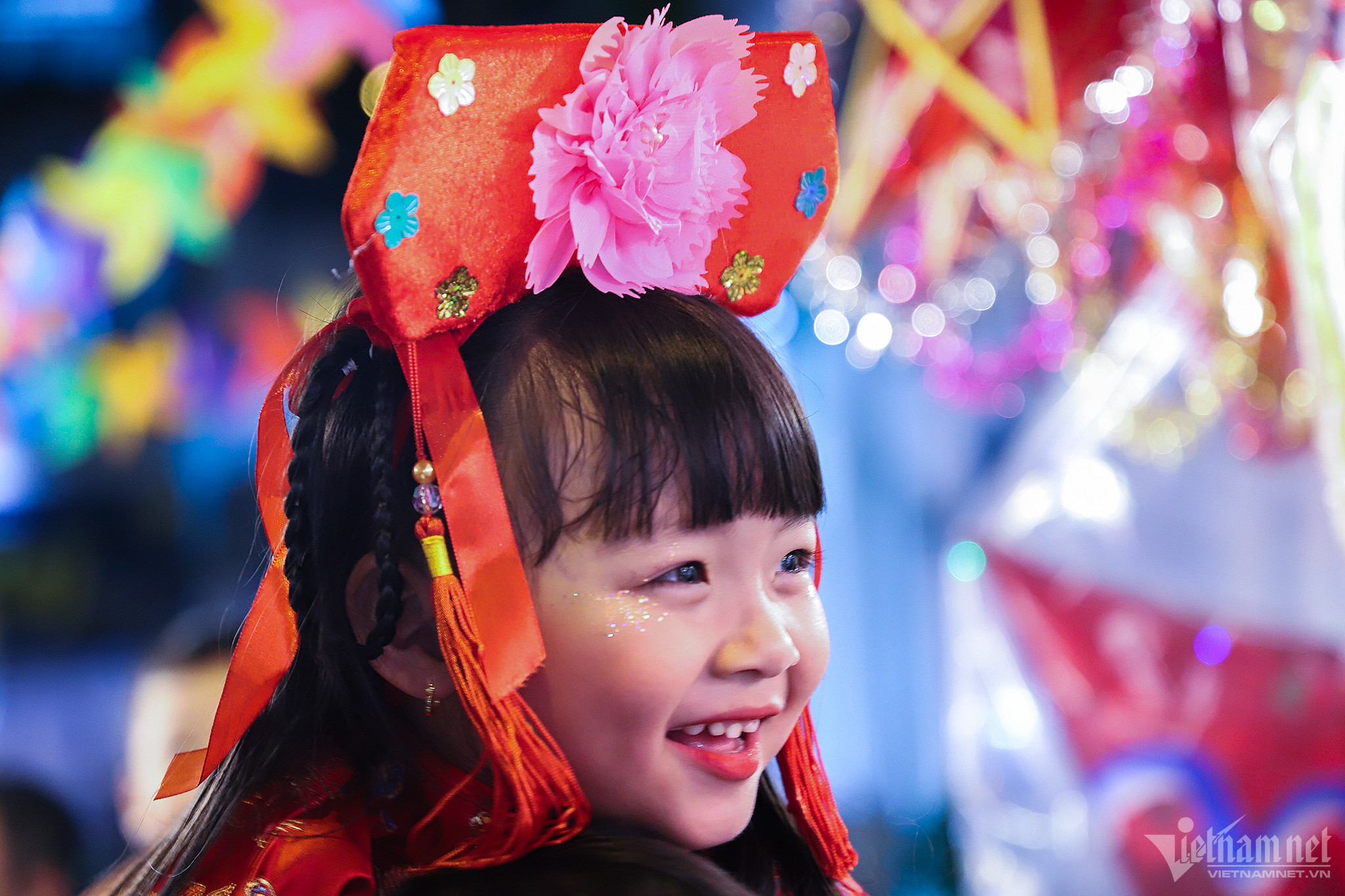 Một bé gái vừa được mua đồ trang trí liền đội lên đầu và dạo quanh phố lồng đèn.