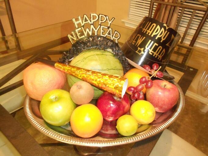 Để đảm bảo may mắn quanh năm, họ trang trí bàn ăn bằng 12 loại trái cây khác nhau. Ngoài việc nhét dưa, cam, nho và các loại trái cây và rau quả tròn khác, người Philippines còn mặc trang phục có hình các quả tròn, hoặc chấm bi, nhằm đón một năm mới tròn đầy, sung túc.