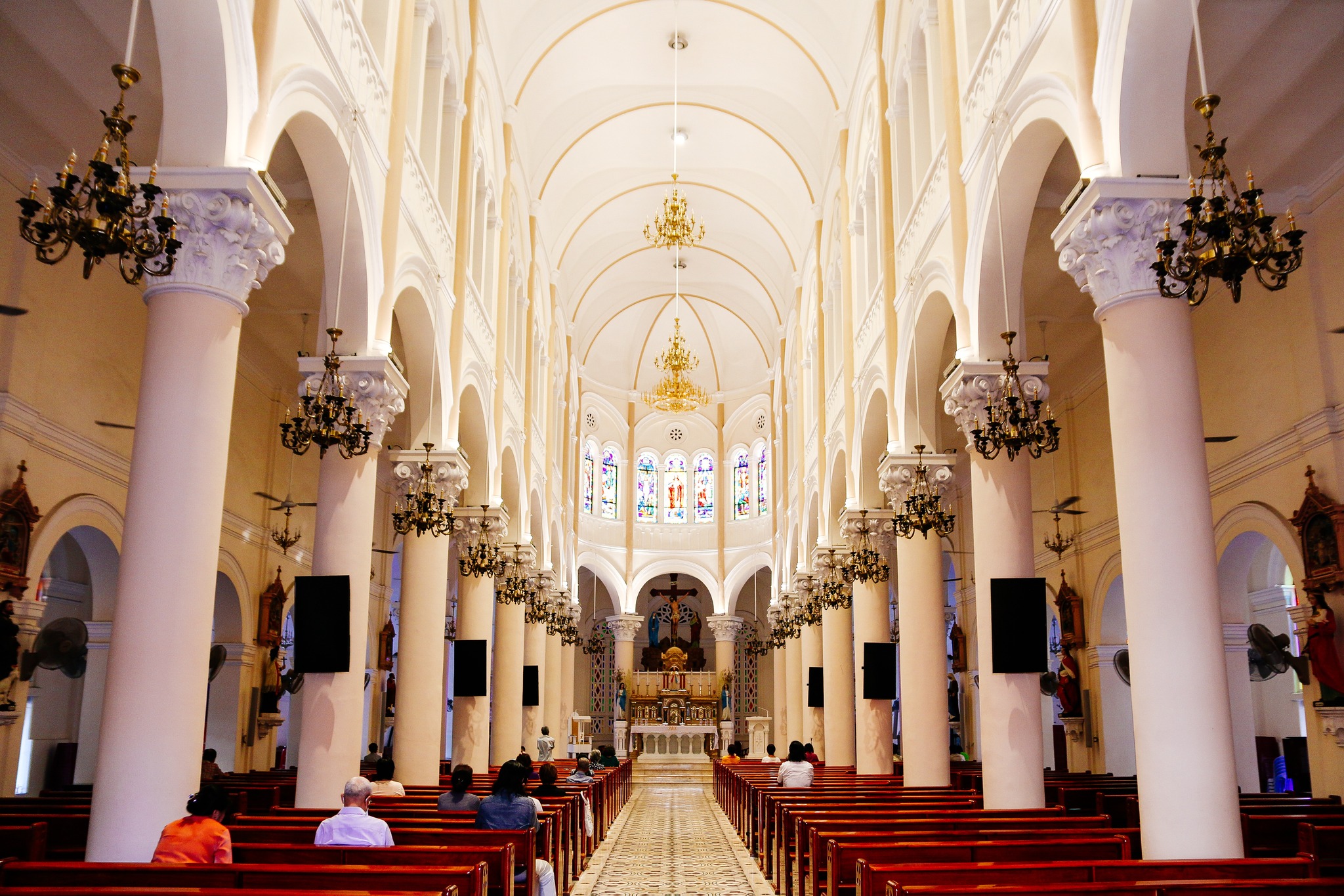Đi vào sâu bên trong Thánh đường, du khách sẽ choáng ngợp trước kiến trúc cổ kính với hai hàng cột Gothic dẫn tới bàn thờ chính. Đa số bàn thờ trong Thánh đường được làm từ các loại đá quý gửi từ Ý sang Việt Nam. Bên cạnh đó là rất nhiều tác phẩm nghệ thuật độc đáo khác được bày trí bên trong, từ các bức tranh cho tới những tượng thánh.
