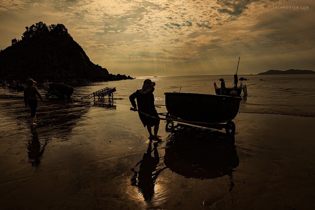 Để câu mực đêm, du khách sẽ lên một chiếc thuyền mủng truyền thống, được đan bằng tre với đường kính khoảng 2m. Hình dáng thuyền trông giống như một chiếc mủng phóng to, từ đó người dân địa phương đã đặt cho nó cái tên "thuyền mủng, thuyền thúng". Ngư dân tối xuống là đi câu. Thường đi nhóm vài 3 thuyền. Khi được mực thì 1 thuyền chạy vào bờ bán ngay cho du khách.